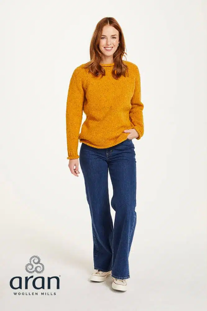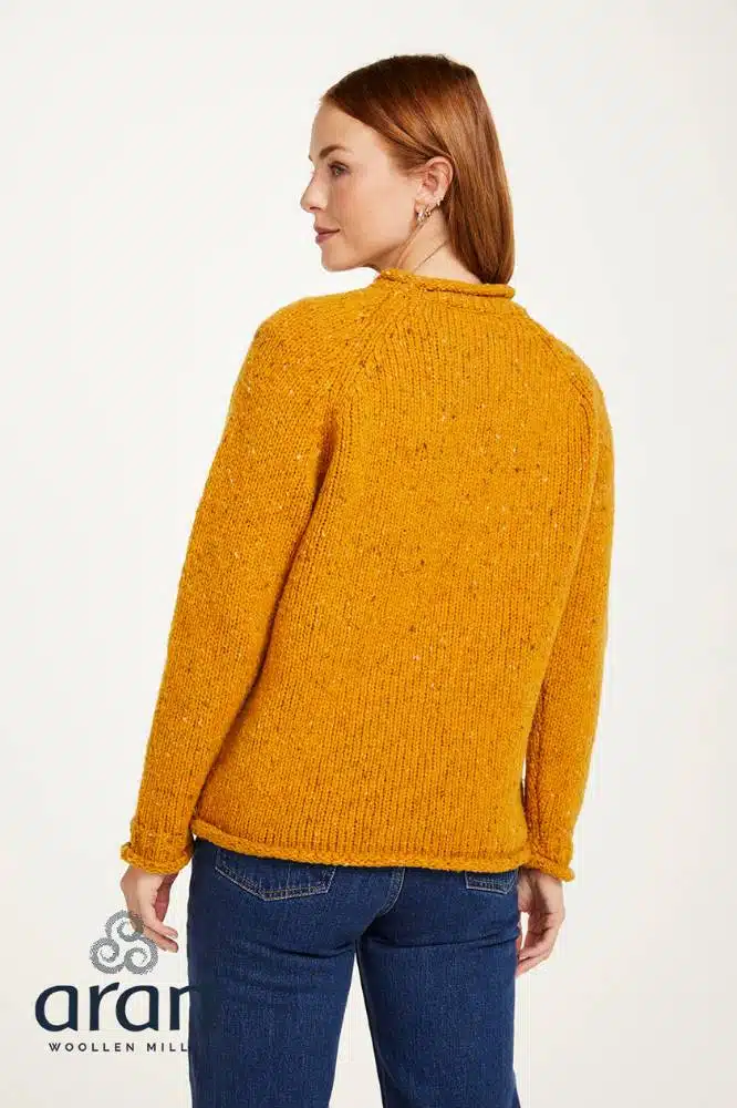 Deze klassieke Ladies Roll Neck Raglan Crew van Aran Woollen Mills is een stijlvolle toevoeging aan je garderobe. Met haar verfijnde eenvoud en subtiele details is deze trui een toonbeeld van Ierse ambacht, gemaakt van 100% pure nieuwe wol met een speels tweed-effect. De nepped yarn geeft de stof een karaktervolle uitstraling, terwijl de raglanmouwen en opgerolde boorden bij hals, mouw en zoom zorgen voor een relaxte, casual look.
