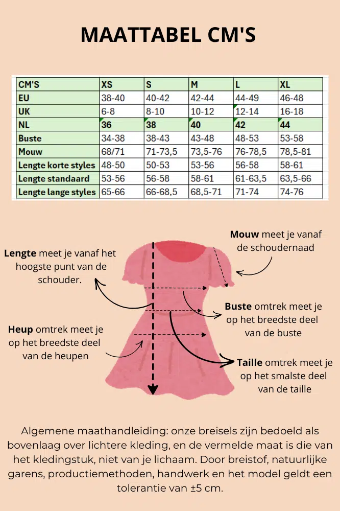 Voor een lange levensduur raden we aan om de trui met de hand te wassen in koud water en plat te laten drogen. Niet wringen of centrifugeren. Bewaar de trui opgevouwen in plaats van hangend om vervorming te voorkomen.