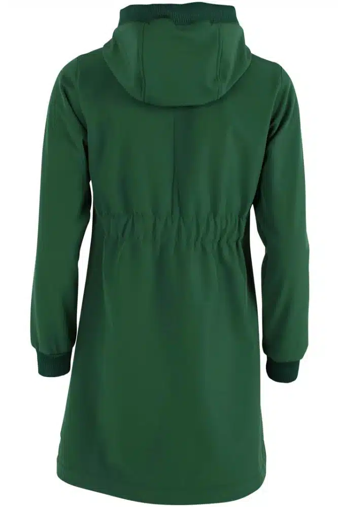 De softshellconstructie bestaat uit drie lagen: een hoogwaardig polyester stretch buitenschild met een fluorvrije, waterafstotende behandeling; een ademend, wind- en waterafstotend membraan; en een zachte, warme polar fleece voering aan de binnenkant. Dit maakt de jas winddicht, ademend en waterafstotend tot 8.000 mm. Let wel: door de fleecevoering aan de binnenkant kunnen de naden niet worden getapet, waardoor bij zware regen enige vochtinfiltratie via de naden mogelijk is. Deze jas is daarom perfect voor lichte tot matige regen, maar geen vervanging van een echte regenjas.