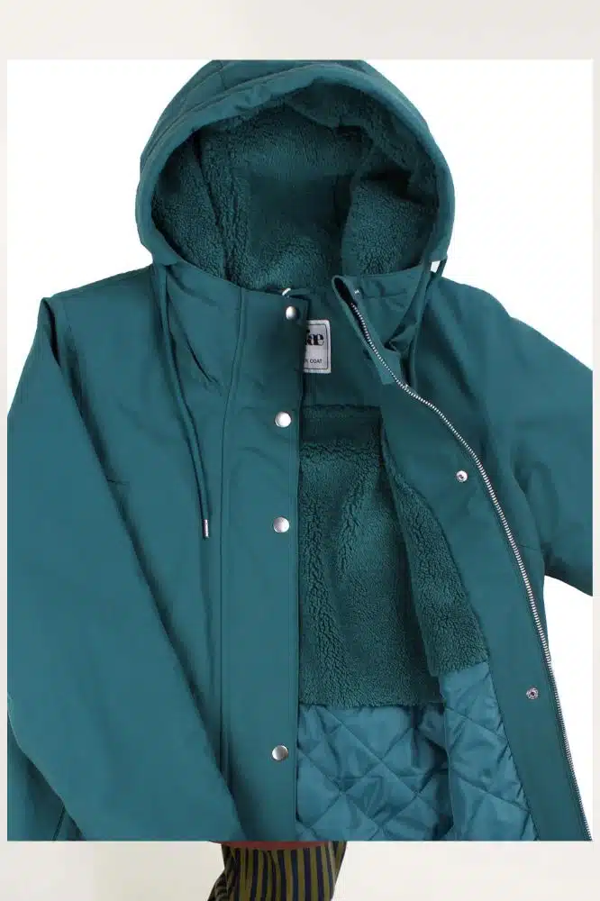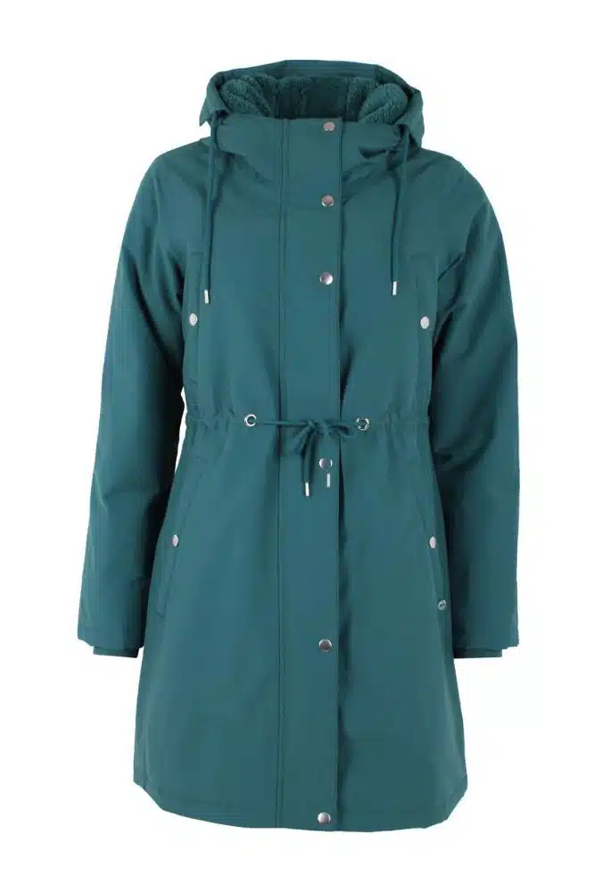 De binnenkant van de Danenora Parka is gevoerd met compact, warm thermofoer dat zorgt voor optimale warmte-isolatie zonder extra volume. Daarnaast maakt het zachte, fuzzy fleece-voering de jas extra comfortabel, zelfs voor de grootste koukleumen. De jas is voorzien van een tweewegrits, beschermd door een paneel met drukknopen, zodat je hem van onderaf kunt openen voor extra bewegingsvrijheid op de fiets. Elastiek bij de polsen houdt wind en kou buiten, terwijl een verstelbaar trekkoord in de taille zorgt voor een vrouwelijke pasvorm.