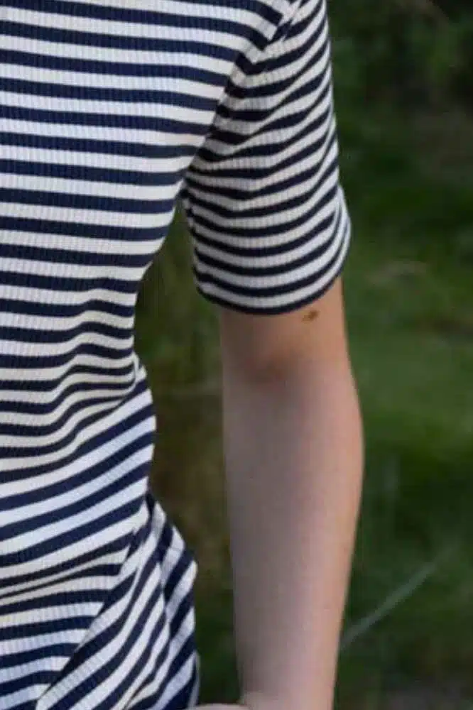 De Danerolemodel Ribbing Tee Dark Navy Chalk van Danefæ is een tijdloos T-shirt met een klassieke snit en een elegante ribstructuur. Dankzij de combinatie van katoen, modal en elastaan voelt dit shirt heerlijk zacht en soepel aan, met precies de juiste hoeveelheid stretch voor een perfecte pasvorm. Het is een veelzijdig kledingstuk dat moeiteloos te combineren is met zowel een broek als een rok en ideaal is om onder een vest of jasje te dragen op koelere dagen.