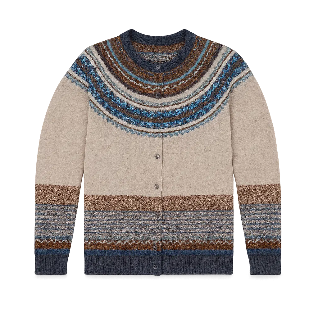 De Alpine Cardigan Taurus van Eribé Knitwear is een iconisch kledingstuk dat vakmanschap en stijl perfect combineert. Dit prachtig ingebreide vest met een traditioneel Fair Isle-patroon is ontworpen om zowel warm als stijlvol te zijn. De licht aangesloten pasvorm, ronde hals met pas en de raglanmouwen geven het vest een klassieke uitstraling, terwijl de extra lange boorden zorgen voor extra comfort. Dankzij de doorknoopsluiting is het vest gemakkelijk te dragen en te combineren met verschillende outfits.