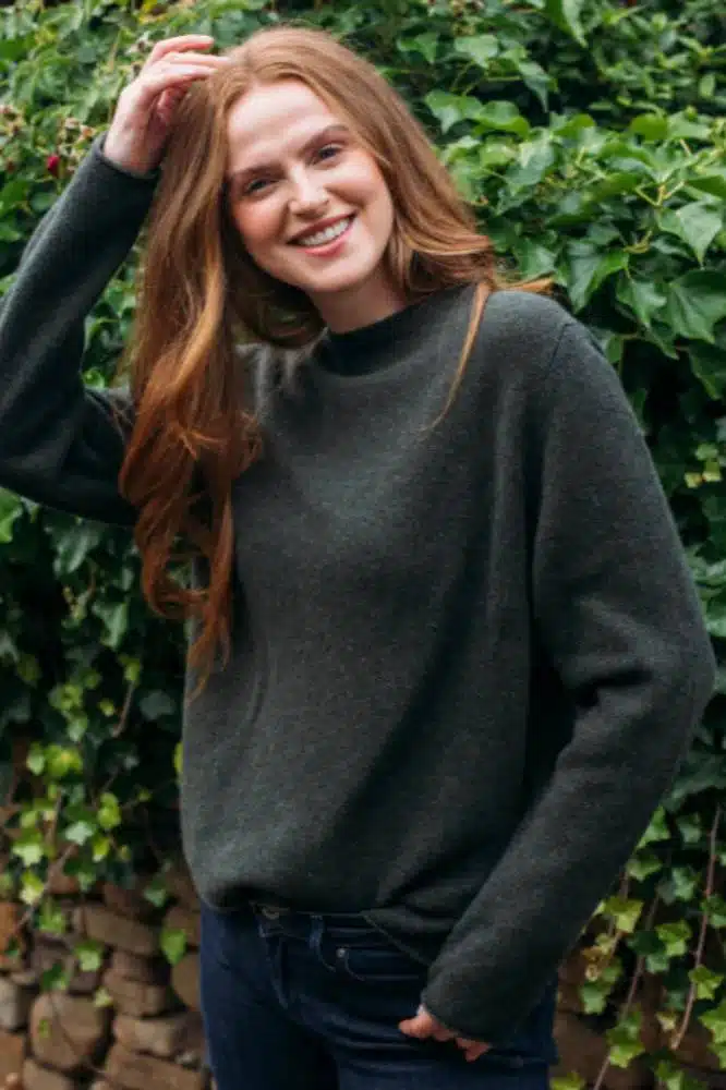 Klik hiervoor alle Eribé-items. • ProductID / SKU: CORRY-SEAWEED • Model draagt: maat S • Pasvorm: relaxed fit • Halslijn: kleine ribboord • Mouwen: lange mouwen zonder boorden • Lengte maat M: ca. 63 cm (body length) • Materiaal: 100% merino lamswol • Kleur: Seaweed (groenblauw) • Herkomst: gebreid in Schotland • Onderhoud: handwas aanbevolen
