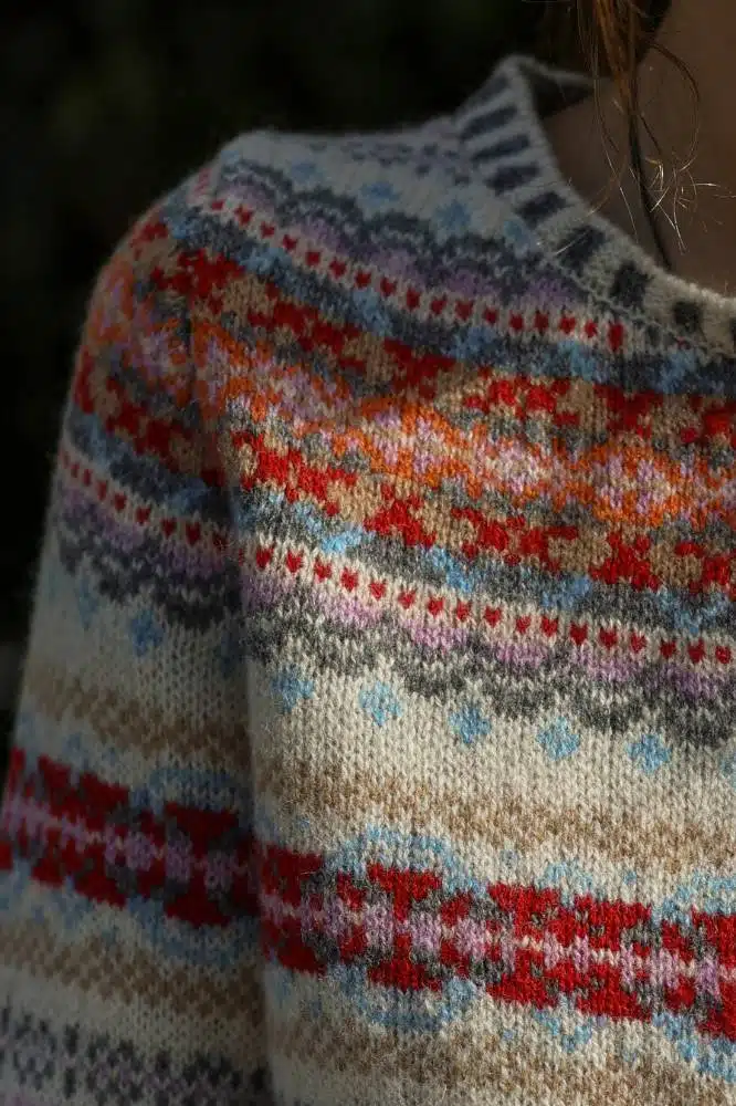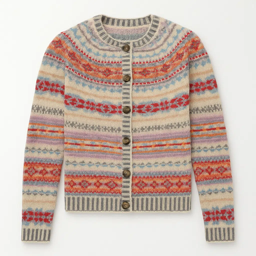 De Mallaig-kleurencombinatie is geïnspireerd op de natuur van Schotland: diepe tinten, warme kleuren en lichte accenten die samen een harmonieuze balans creëren. De veelzijdigheid maakt dat je deze cardigan zowel casual als gekleed kunt dragen, en dat hij moeiteloos matcht met jeans, corduroy of een wollen rok.