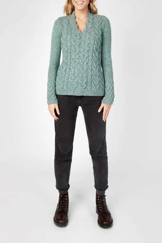 Irelands Eye Horseshoe Cable V Neck Ocean Mist