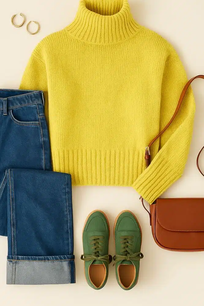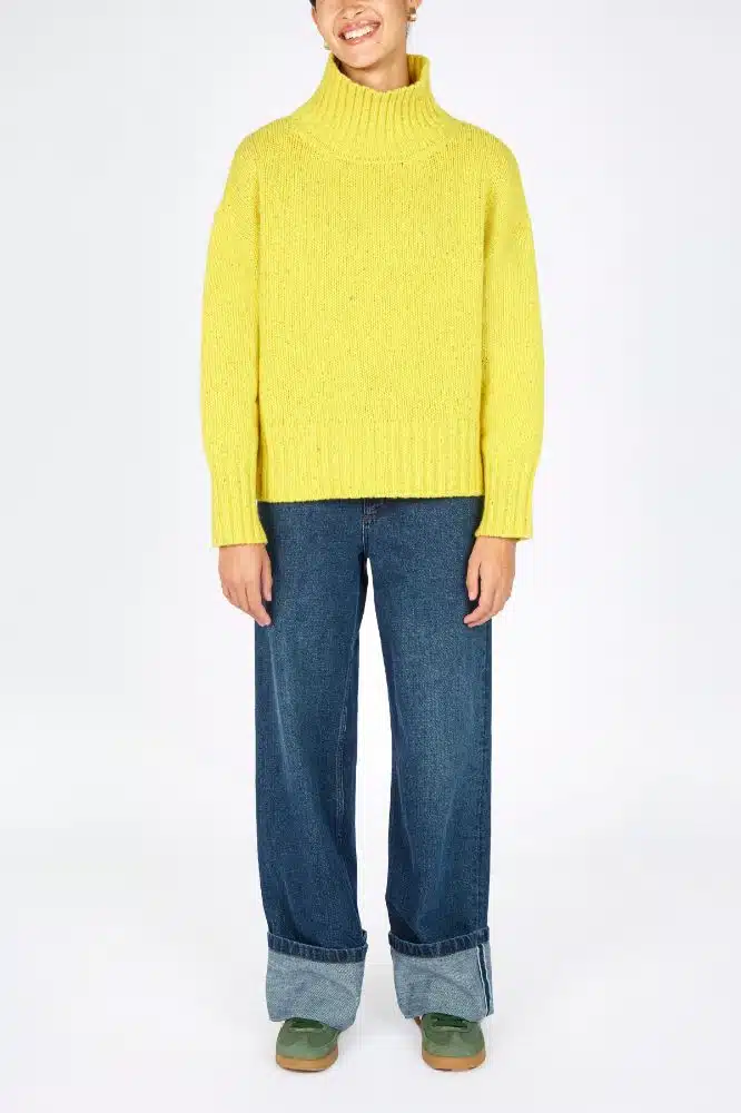 • SKU / Product ID: nog niet gespecificeerd • Model draagt: maat S, lengte 178 cm • Pasvorm: relaxed fit, valt royaal • Lengte: heuplengte • Hals: hoge col • Mouwen: lange mouwen met verlaagde schouder • Kleur: Buttercup • Materiaal: 95% wol, 5% cashmere • Afwerking: ribboorden aan mouwen en zoom