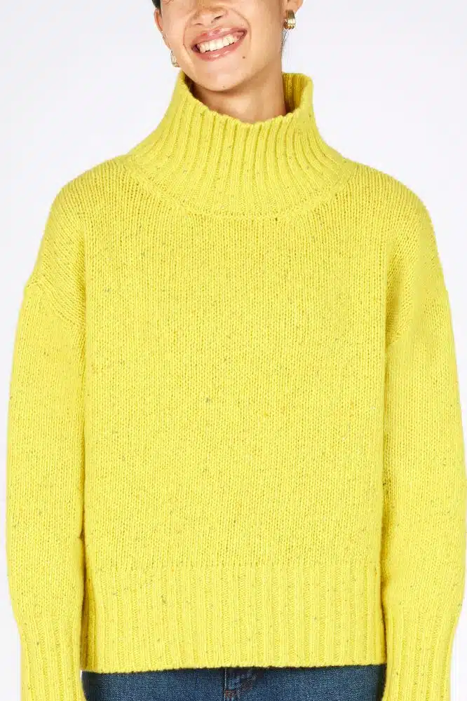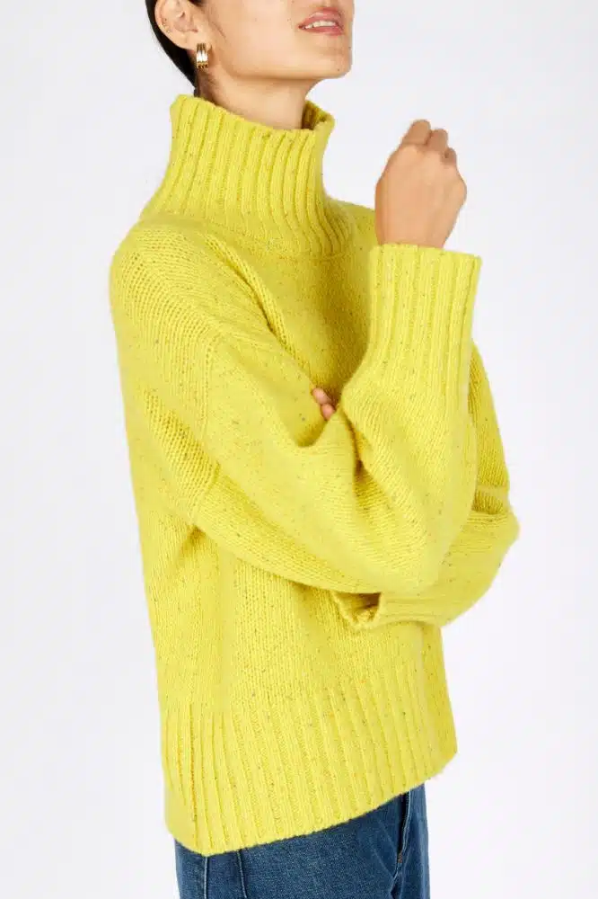 De Paige Polo Neck van IrelandsEye in de kleur Buttercup is een luxueus en comfortabel gebreid kledingstuk dat vakmanschap en tijdloze elegantie samenbrengt. Deze stijlvolle coltrui maakt deel uit van de Genesis-collectie en is vervaardigd van 100% natuurlijke garens: een premium blend van 95% wol en 5% cashmere. Dat zorgt voor een heerlijk zachte feel en een rijke, hoogwaardige uitstraling. De kleur Buttercup is een levendige gele tint met speelse, veelkleurige spikkels – subtiel en uniek tegelijk.