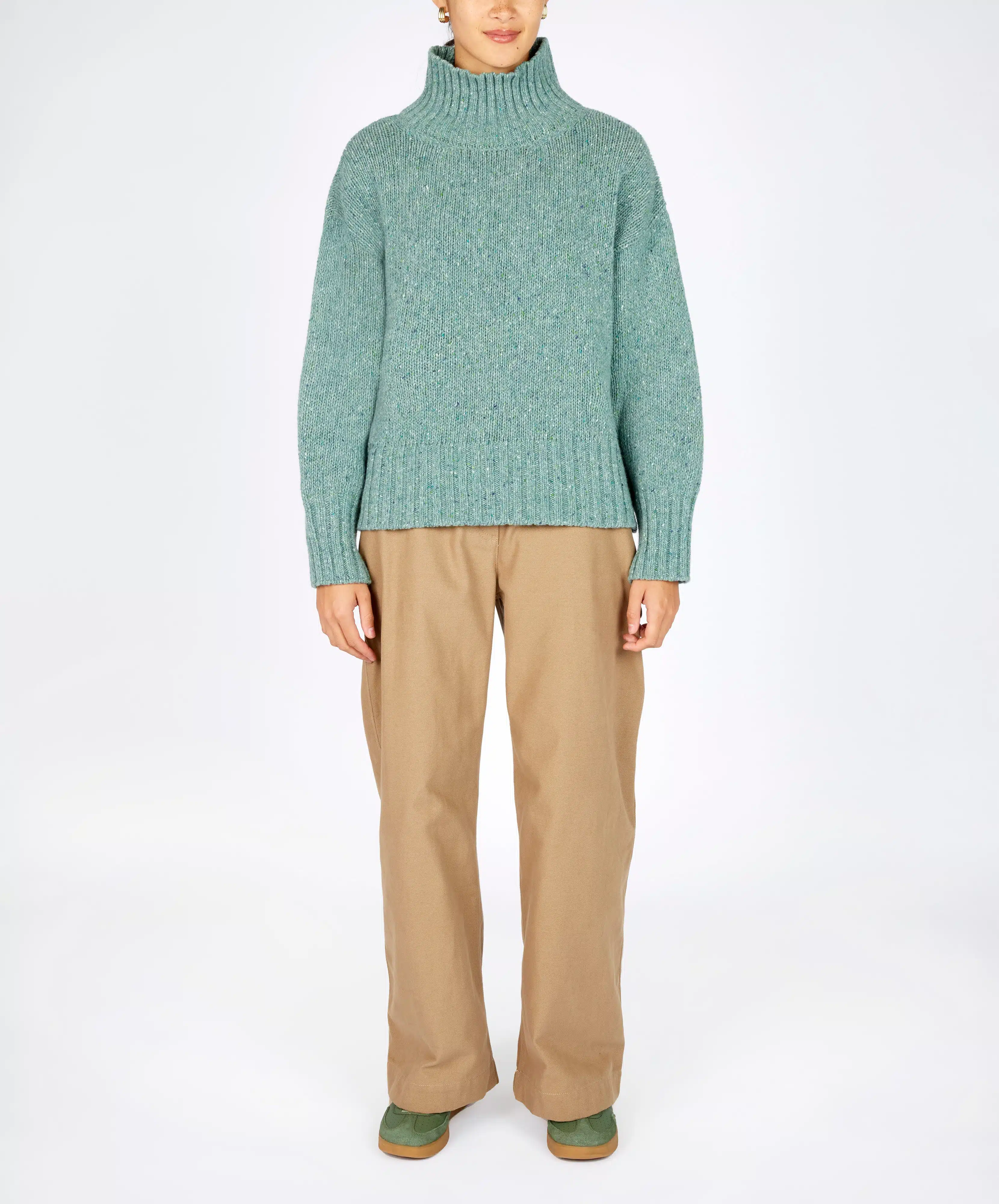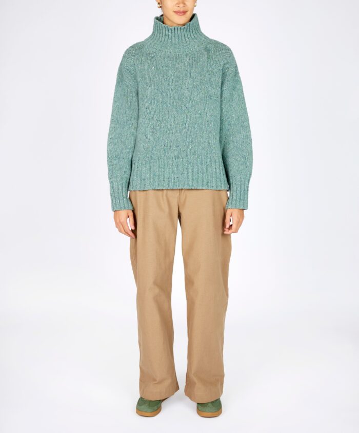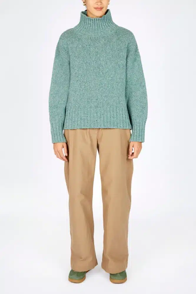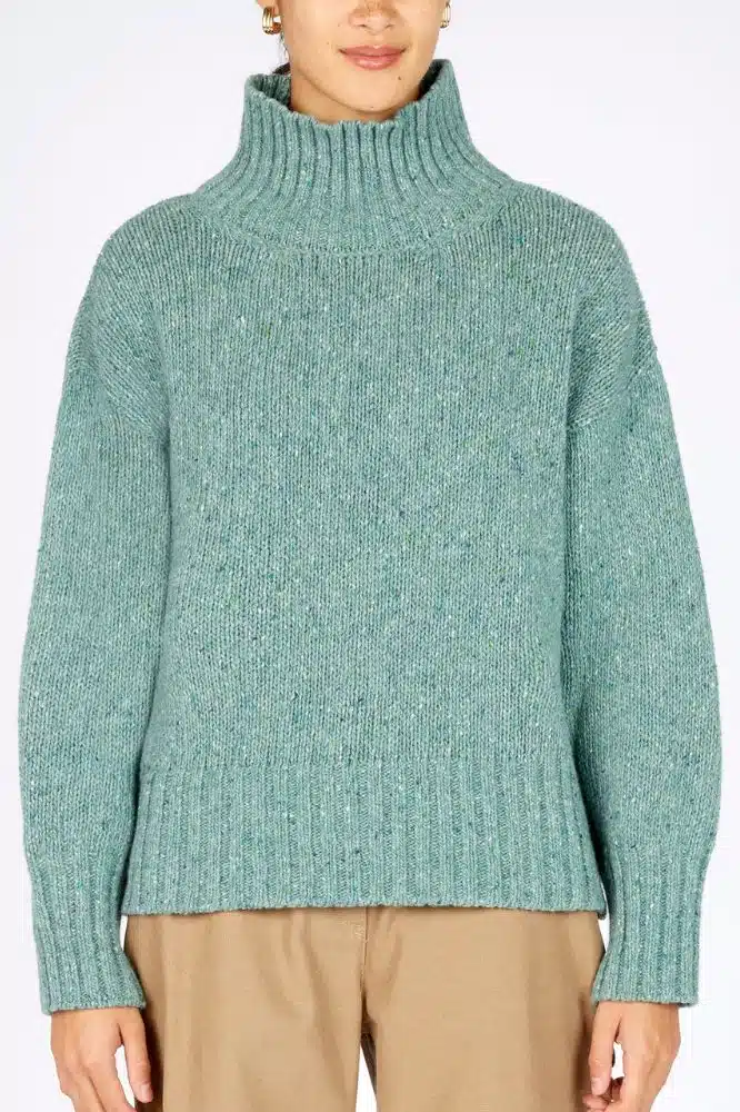De Paige Polo Neck van IrelandsEye in de kleur Ocean Mistis een luxueus en comfortabel gebreid kledingstuk dat vakmanschap en tijdloze elegantie samenbrengt. Deze stijlvolle coltrui maakt deel uit van de Genesis-collectie en is vervaardigd van 100% natuurlijke garens: een premium blend van 95% wol en 5% cashmere. Dat zorgt voor een heerlijk zachte feel en een rijke, hoogwaardige uitstraling. De kleur Ocean Mist is een levendige zachtgroene tint met speelse, veelkleurige spikkels – subtiel en uniek tegelijk.