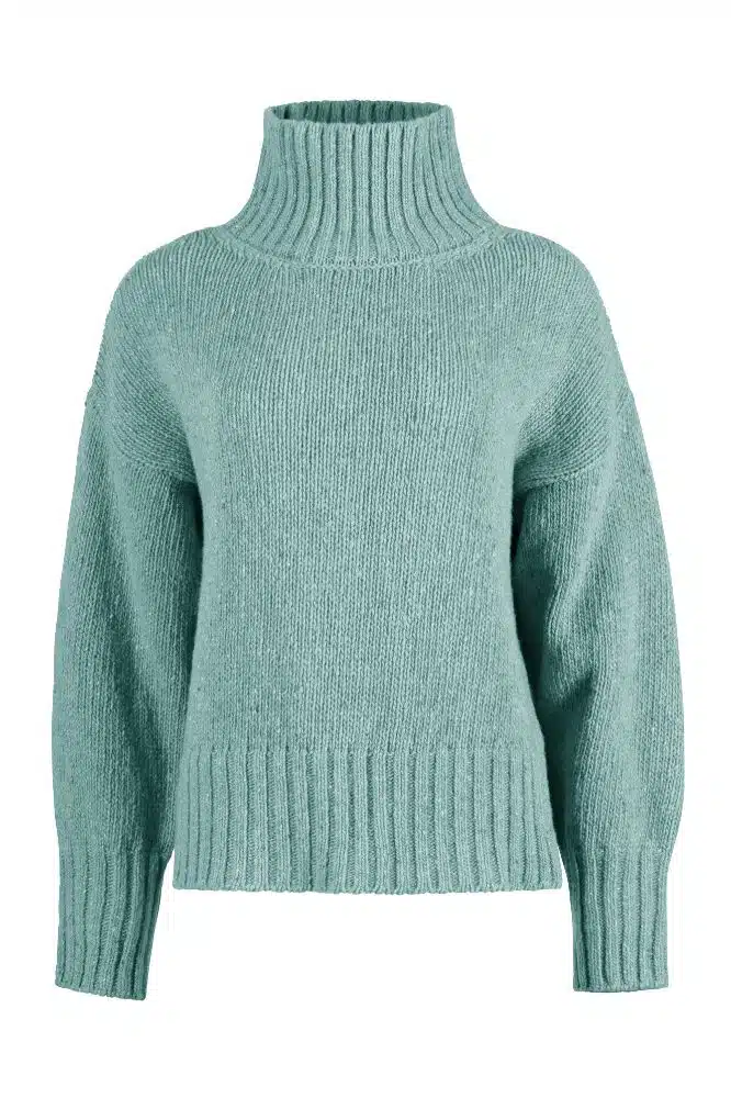 • SKU / Product ID: nog niet gespecificeerd • Model draagt: maat S, lengte 178 cm • Pasvorm: relaxed fit, valt royaal • Lengte: heuplengte • Hals: hoge col • Mouwen: lange mouwen met verlaagde schouder • Kleur: Ocean Mist • Materiaal: 95% wol, 5% cashmere • Afwerking: ribboorden aan mouwen en zoom