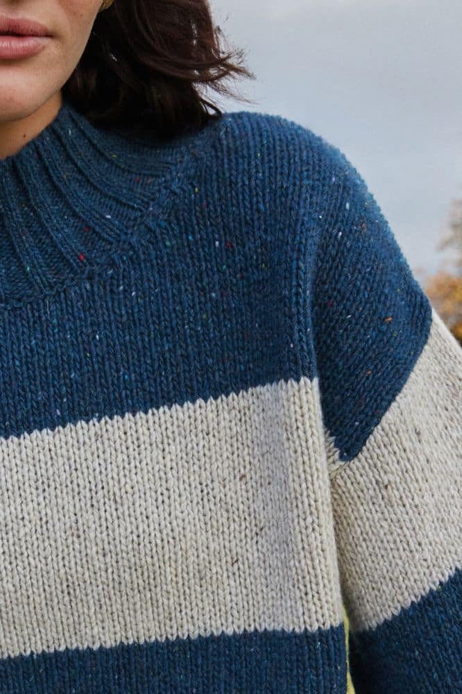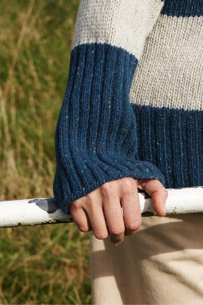 De Arna Stripe Funnel Neck van IrelandsEye is een luxe, eigentijdse trui met een tijdloos streeppatroon. Het ontwerp combineert diepe ink marl-tinten met multicoloured flecks en lichtere chalkstone-strepen met subtiele neps in crème en bruin. Het resultaat is een verfijnd kleurenspel dat moeiteloos past bij jeans, wollen rokken of een nette broek.