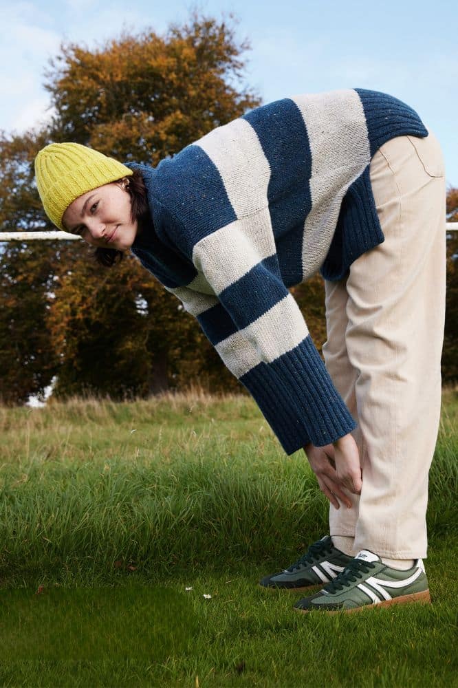 IrelandsEye is een Iers familiebedrijf dat bekendstaat om zijn vakmanschap in gebreide kleding. Elk stuk wordt ontworpen en geproduceerd in Dublin, geïnspireerd door het ruige Ierse landschap en eeuwenoude breitradities. Het merk werkt uitsluitend met natuurlijke vezels en combineert klassieke patronen met een moderne twist, zoals te zien in de Arna Stripe Funnel Neck.