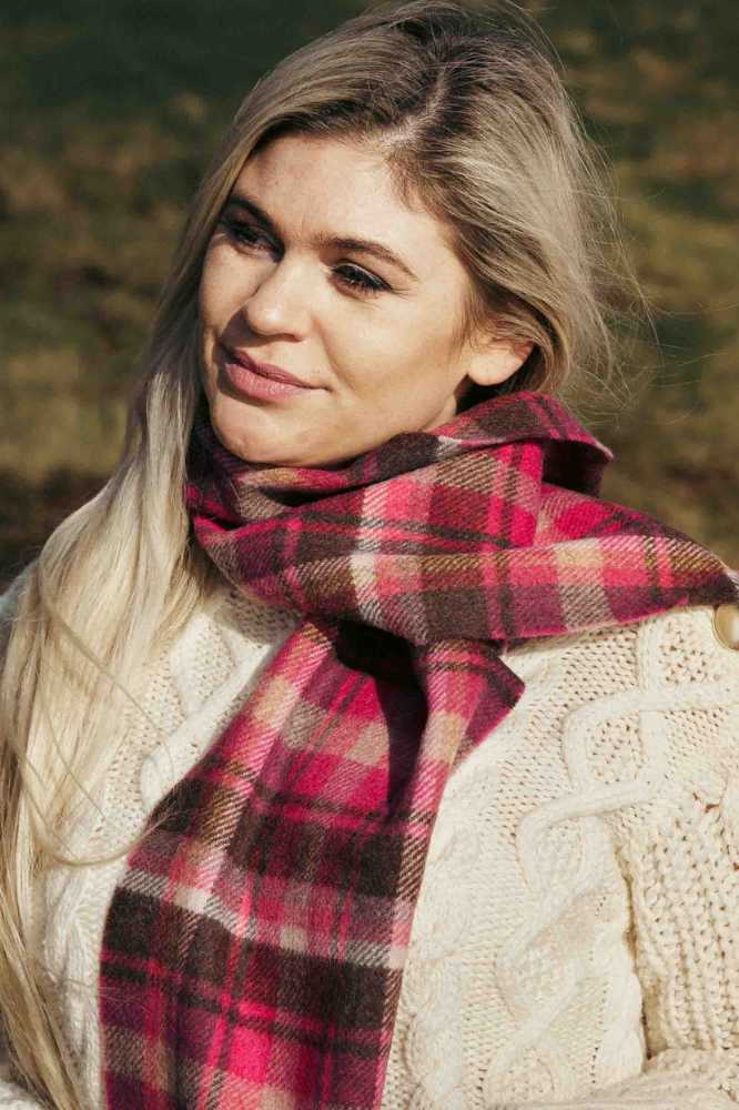John Hanly Irish Wool Scarf Long 1914 Pink Maroon Check