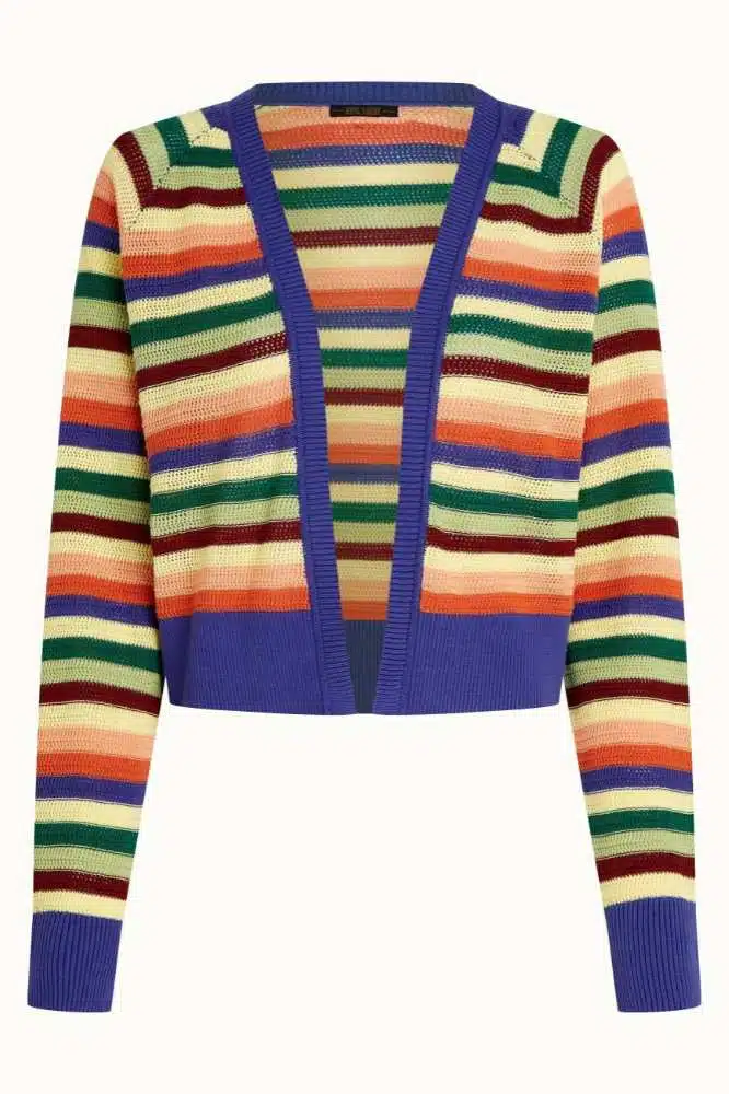 De Blanca Cardi in de kleur Molo Bluing van King Louie is een echte eyecatcher voor elke dag. Deze fijngebreide cardigan is gemaakt van zacht, GOTS-gecertificeerd biologisch katoen en voelt heerlijk comfortabel aan op de huid. De levendige, horizontale strepen in blauwe tinten geven het vest een speels karakter, terwijl de contrasterende geribde boorden aan de mouwen, hals en zoom zorgen voor een verfijnde afwerking. De raglanmouwen geven een casual en sportieve touch en zorgen tegelijkertijd voor extra bewegingsvrijheid. Dankzij de subtiele stretch beweegt het vest prettig met je mee, wat het perfect maakt voor dagelijks gebruik.