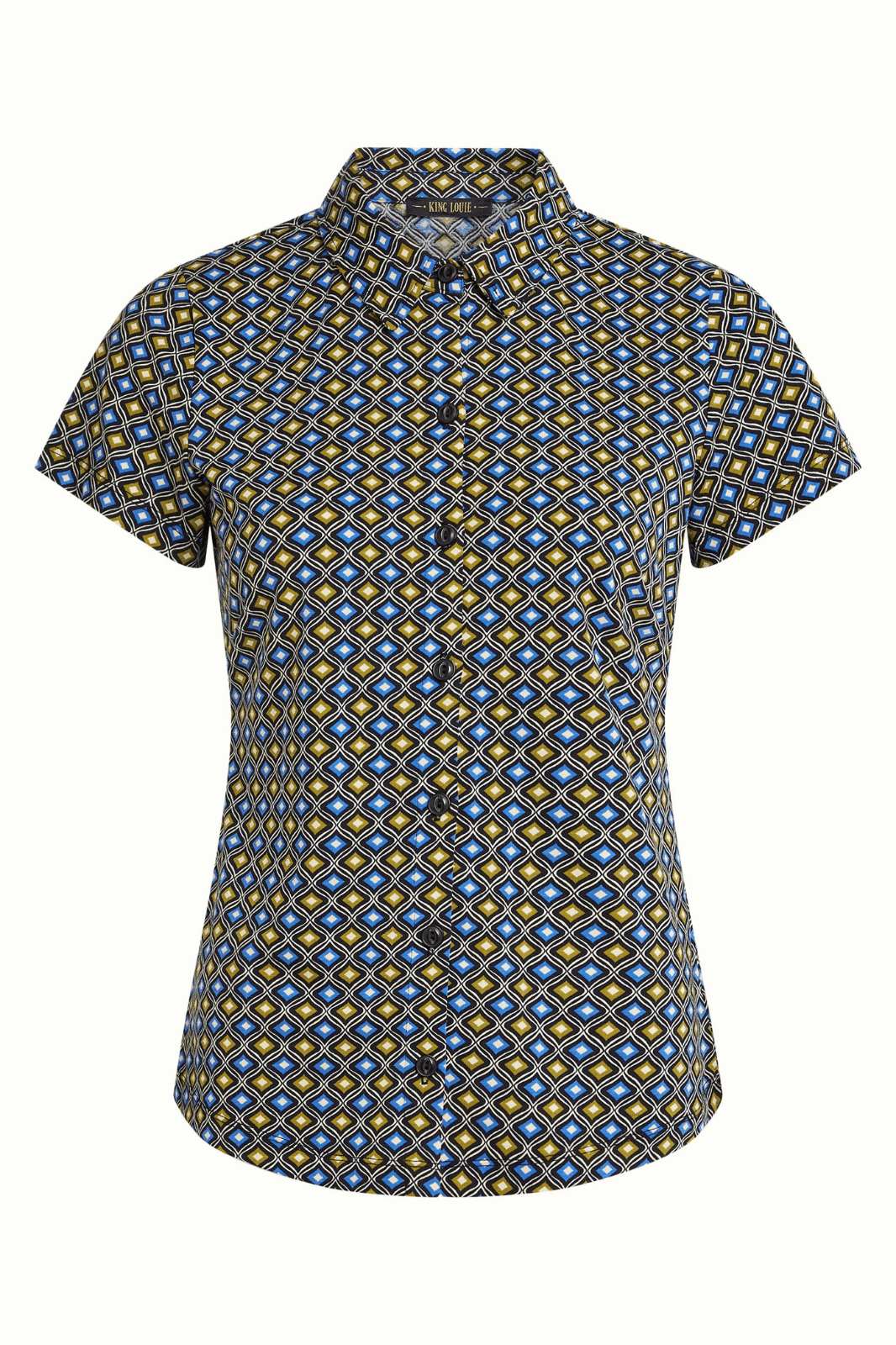 De Blouse Blend in Black van King Louie is een krachtige combinatie van klassiek en modern. De geometrische print geeft diepte aan het zwarte basispalet, terwijl de fitted pasvorm zorgt voor een vrouwelijk silhouet.