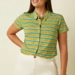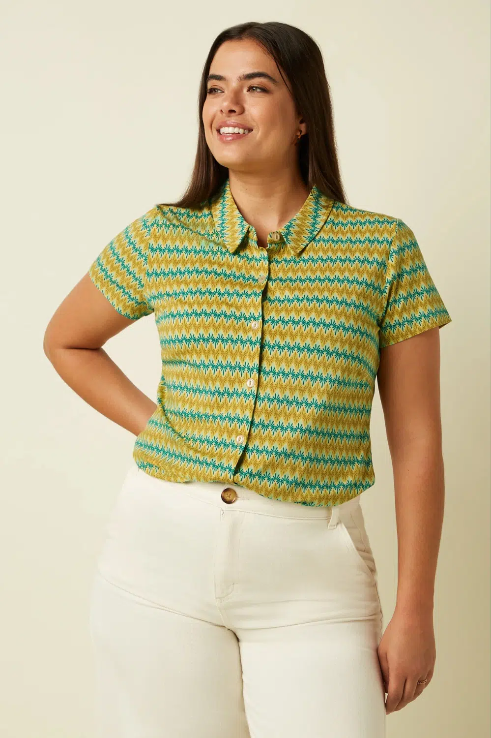 De Blouse Saro in Spring Yellow van King Louie is een vrouwelijke blouse met een speelse zigzagprint. De frisse gele kleur en het grafische patroon geven de blouse een vrolijke uitstraling die perfect past bij het voorjaar en de zomer.
