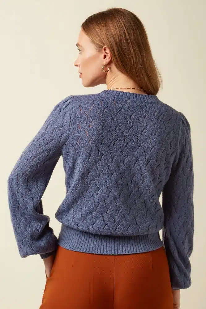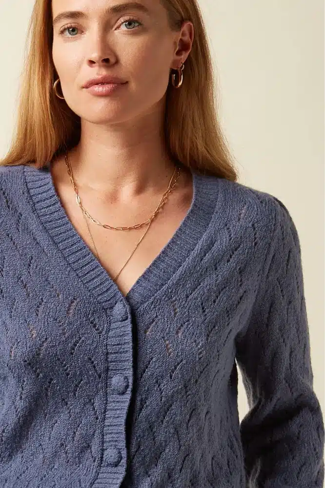 De Cardi V Farfalle Shadow Blue van King Louie is een stijlvolle basic met eindeloos veel draagmogelijkheden. Dit vest heeft een klassieke V-hals, een comfortabele stretch en een rechte pasvorm die mooi aansluit zonder strak te zitten. Gemaakt van een zachte mix van acryl, nylon, wol en mohair, voelt dit vest warm en licht tegelijk – perfect als extra laagje op frisse dagen of als subtiel accent over een jurk of blouse.