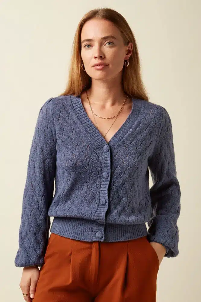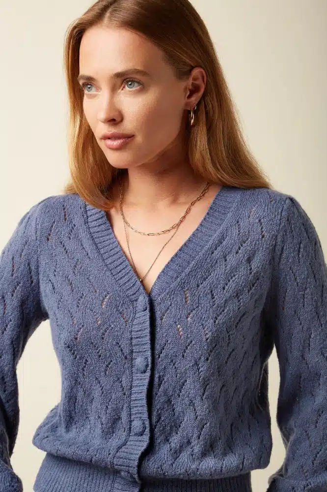 De fijne knit-structuur geeft de cardigan een tijdloze uitstraling, terwijl de eenvoudige knoopsluiting het geheel moeiteloos elegant maakt. De kleur maakt het vest veelzijdig en combineerbaar met elke outfit – van casual denim tot een chique rok. De lange mouwen en V-hals zorgen voor een flatterend silhouet, geschikt voor zowel werk als vrije tijd. Dankzij de stretch in het materiaal beweegt dit vest prettig met je mee, en behoudt het zijn vorm gedurende de dag.