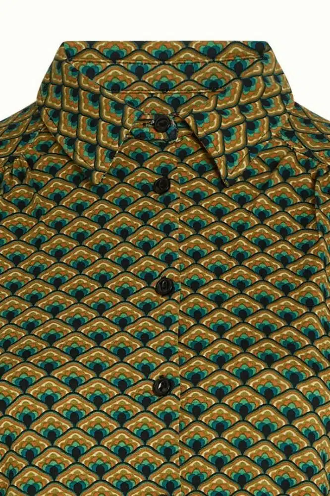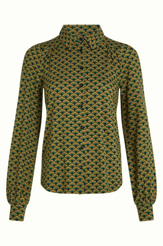 De Carina Blouse Frio Spruced Green van King Louie is een verfijnde blouse met een comfortabele stretch die elegantie en draaggemak combineert. Het opvallende grafische dessin in spruced green zorgt voor een moderne uitstraling, terwijl de klassieke details het ontwerp een tijdloos karakter geven. Denk aan een nette kraag, lange mouwen met manchetten en een doorlopende knoopsluiting. De blouse is gemaakt van soepele jersey met stretch, waardoor hij mooi aansluit en tegelijkertijd bewegingsvrijheid biedt.