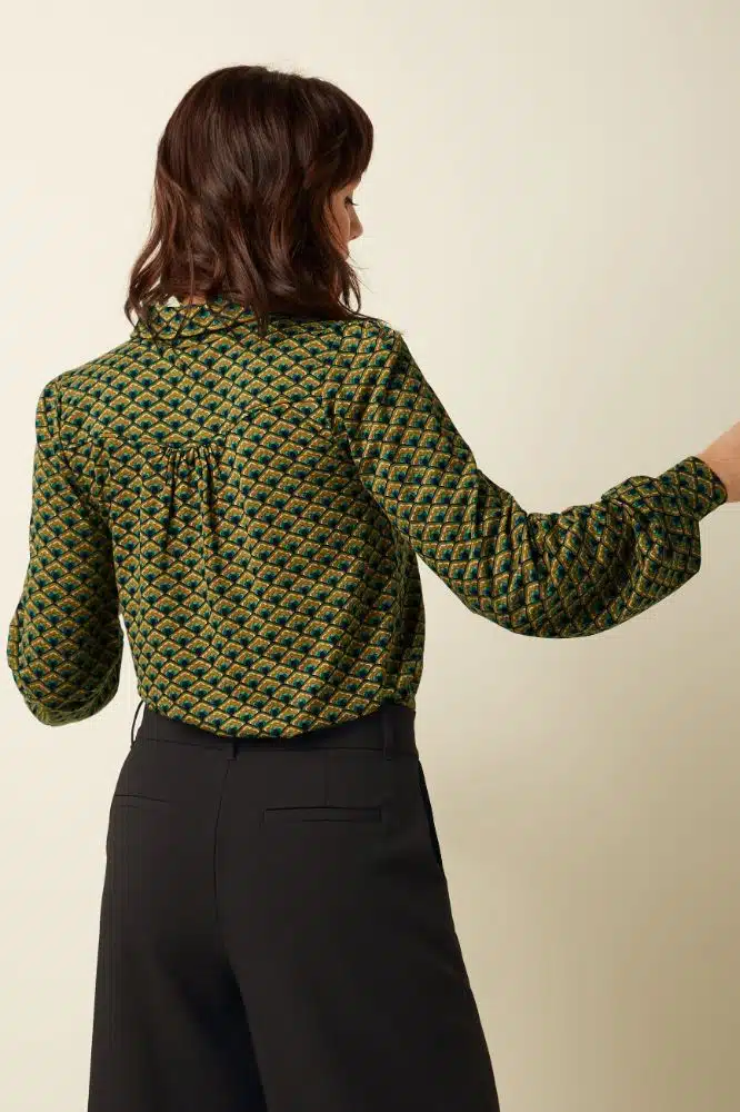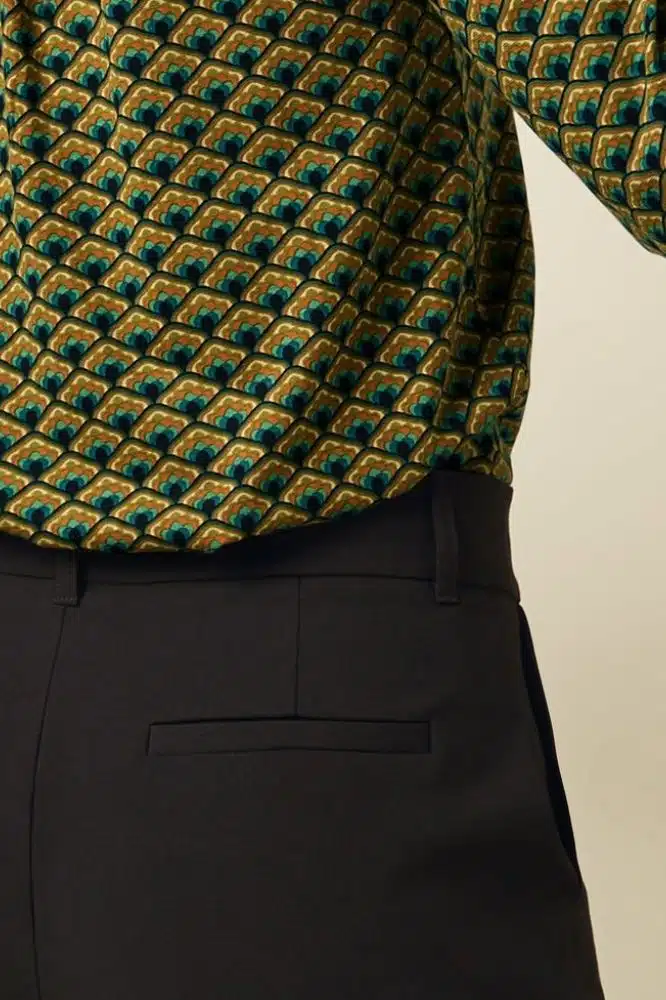 Bijzonder aan deze blouse zijn de plooien vanaf de schouderpas en aan de mouwen. Deze geven het geheel een zachte, vrouwelijke vorm en accentueren de schouderlijn subtiel. De lange mouwen zijn afgewerkt met manchetten die je zowel netjes als nonchalant kunt dragen. De stof heeft een lichte glans en voelt zacht aan op de huid, wat hem niet alleen geschikt maakt voor het werk, maar ook voor een etentje of een dagje uit.