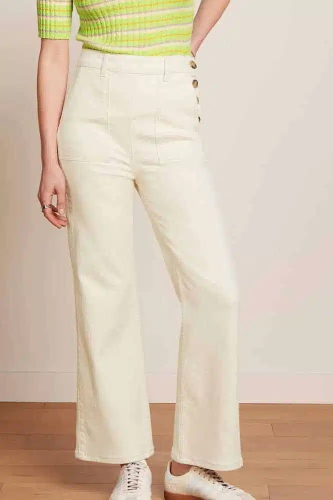 De Debra Pants Retro Denim Ivory van King Louie combineert vintage stijl met modern comfort. Deze rechte broek is gemaakt van zachte, geweven keperstof en heeft een elegante uitstraling dankzij de knoopsluiting aan de zijkant en de opgezette zakken. De tailleband met riemlussen biedt de mogelijkheid om je look extra flair te geven met een stijlvolle riem. Door de comfortabele stretch in de stof past de broek perfect bij een actieve levensstijl, terwijl de ivoorkleur een frisse en veelzijdige toevoeging is aan je garderobe.