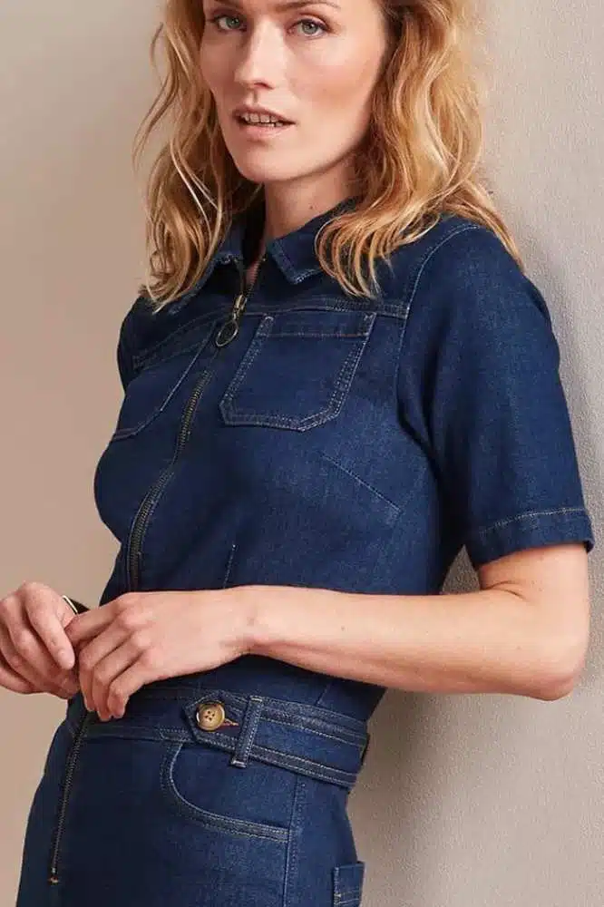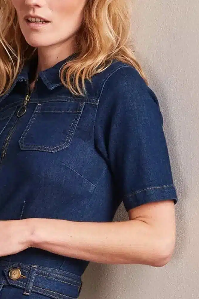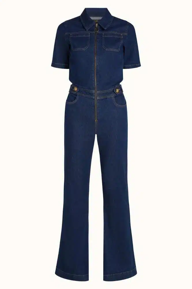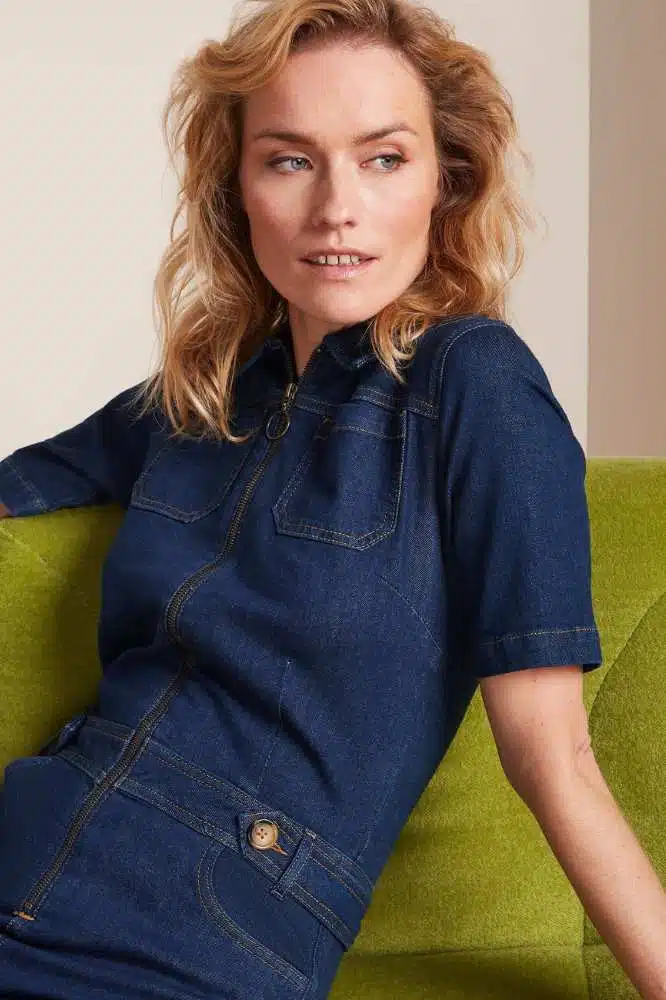 De blousekraag, korte mouwen en zichtbare ritssluiting geven deze jumpsuit een casual-chique uitstraling. De effen diepe indigotint maakt het een tijdloze klassieker, terwijl de subtiele decoratieve details en praktische zakken het geheel net dat beetje extra geven. Of je nu naar kantoor gaat, een dagje stad plant of een diner op de planning hebt – deze jumpsuit is altijd een stijlvolle keuze.