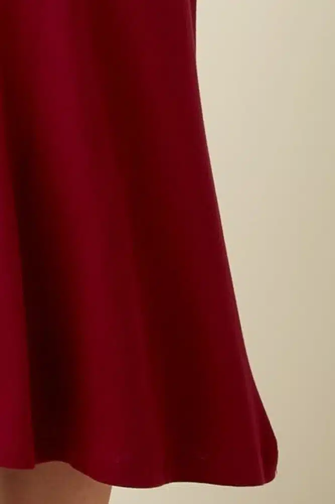 • ProductID / SKU: 9030001 • Model draagt: maat M, lengte 1,71 m • Pasvorm: uitlopend model (A-lijn) • Lengte: midi (over de knie) • Taille: smalle tailleband • Materiaal: 65% LENZING™ ECOVERO™ viscose, 25% polyamide, 10% elastaan • Jersey crepe kwaliteit met stretch • Kleur: Cabernet Red • Gemaakt in: Türkiye (fabriek: Suteks Tekstil) • Fabrikant is geaudit door Fair Wear Foundation