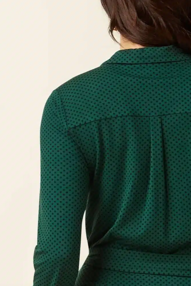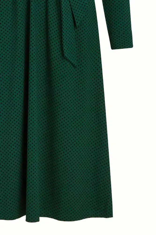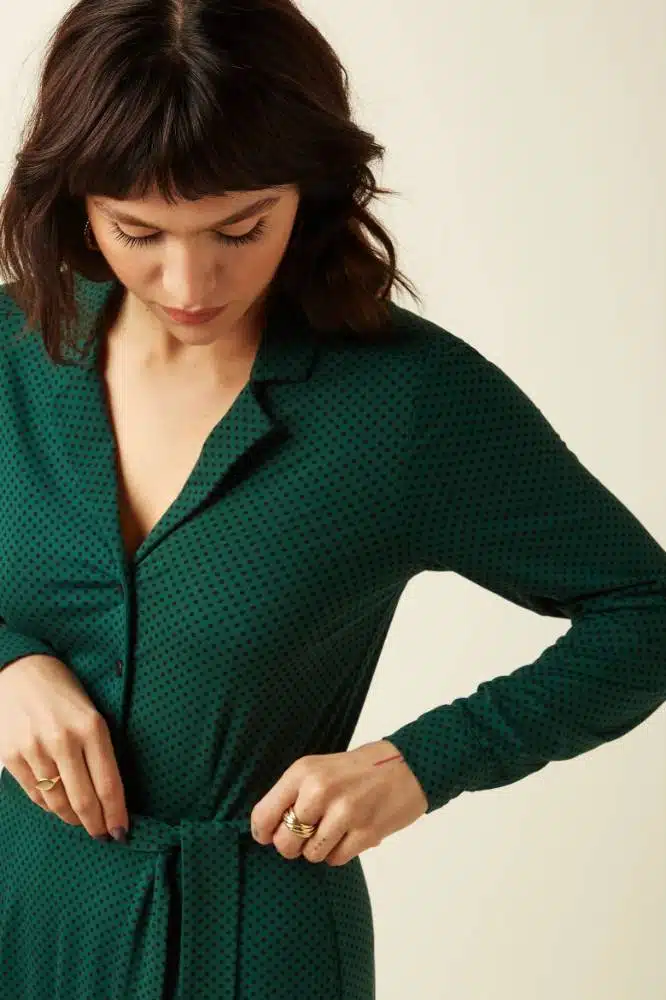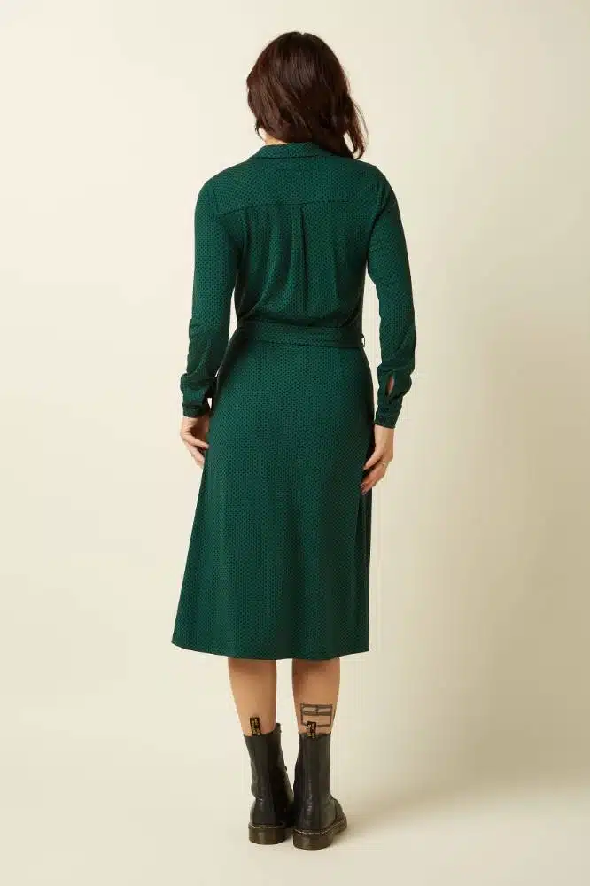 Het ontwerp is rijk aan details: de lapel collar (reverskraag) geeft de jurk een chique uitstraling, terwijl de lange mouwen zorgen voor een stijlvol en ingetogen silhouet. De knoopsluiting over de hele lengte maakt de jurk veelzijdig te dragen – losjes open als lange blouse over een top en broek, of dichtgeknoopt als klassieke midi-jurk. Het meegeleverde ceintuur accentueert de taille en zorgt voor een vrouwelijke balans in de flared vorm.