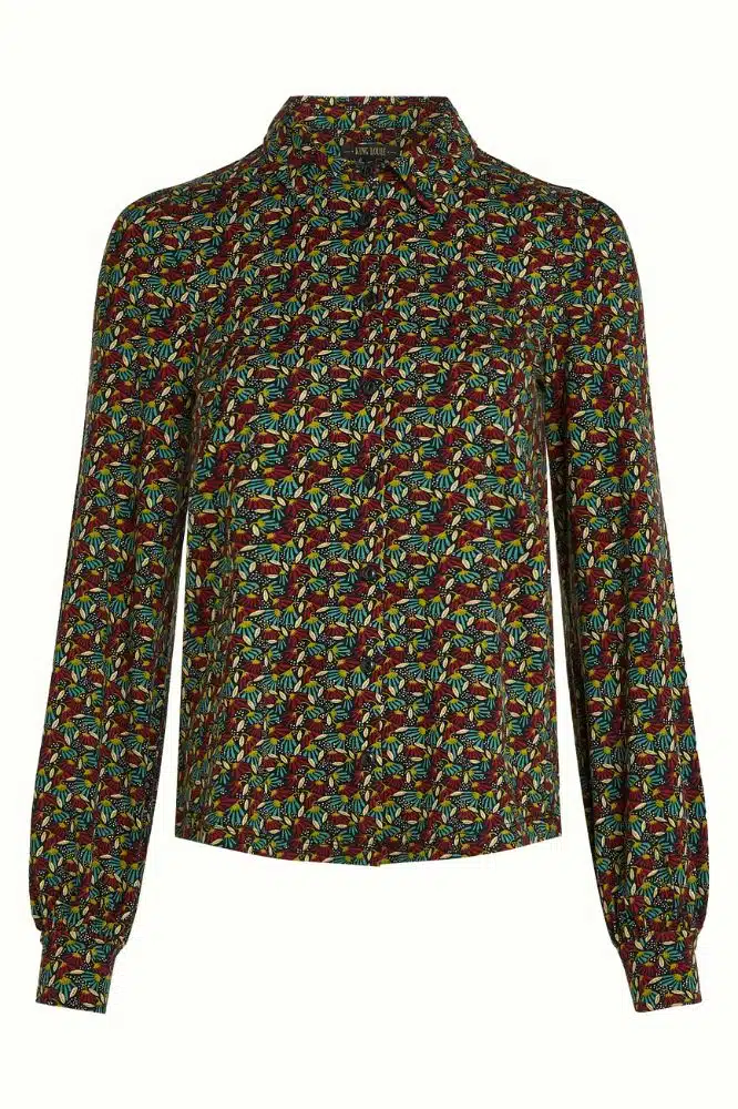 Klik hiervoor alle King Louie blouses. • ProductID / SKU: 10180678 • Model draagt: maat S, lengte 1,77 m • Pasvorm: licht getailleerd, stretch jersey • Halslijn: klassieke kraag • Mouwen: lange mouwen met manchetten • Sluiting: knopenrij voor • Materiaal: 95% LENZING™ ECOVERO™ viscose, 5% elastaan • Kleur/print: multicolor floral • Gemaakt in: Türkiye • Seizoen: W25 • Onderhoud: fijne was op 30°C, plat drogen, niet in droger