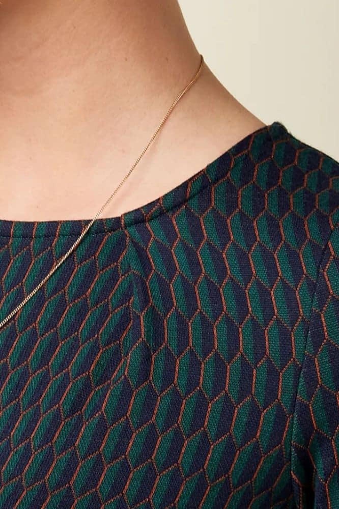 • ProductID / SKU: 10084445 • Model draagt: maat S, lengte 1,79 m • Pasvorm: fitted, tailleband vast, knie-lengte • Halslijn: ronde hals met plooitjes • Mouwen: ¾-mouwen • Zakken: zijzakken • Materiaal: jersey jacquard met stretch • Kleur: Evening Blue met grafische print • Gemaakt in: Türkiye