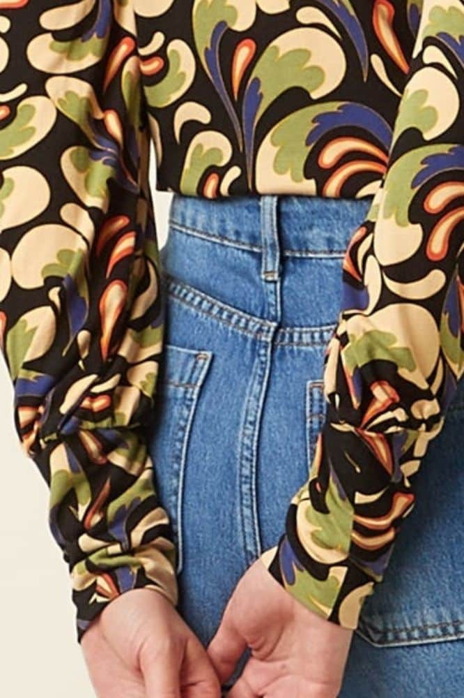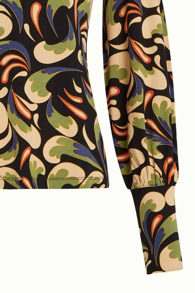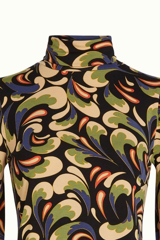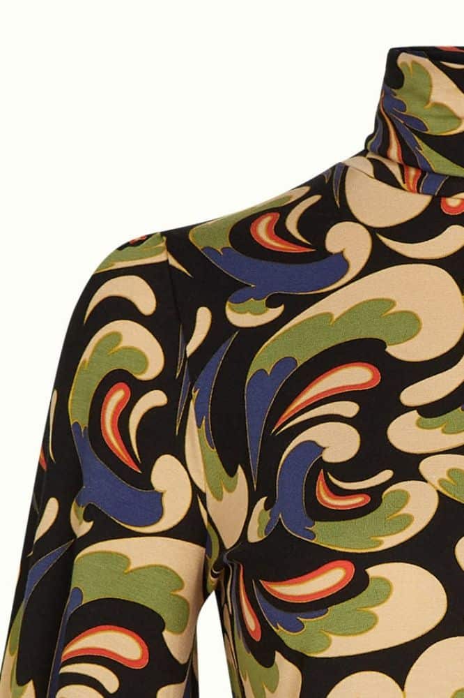 Dankzij de jerseykwaliteit van de stof voelt de Ricky Top heerlijk soepel en stretchy aan. De aangesloten pasvorm wordt prachtig in balans gebracht door de brede manchetten en volumineuze mouwen. De turtle-neck zorgt voor een stijlvolle en elegante touch die perfect past bij het koelere seizoen. De print – grafisch, retro en modern tegelijk – voegt kleur en karakter toe aan elke outfit.