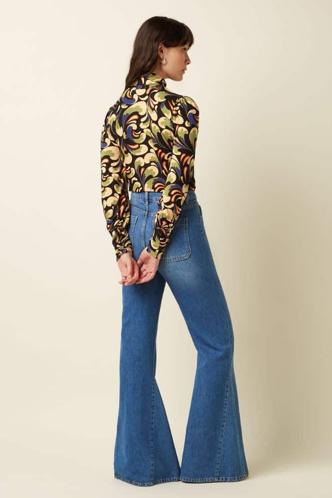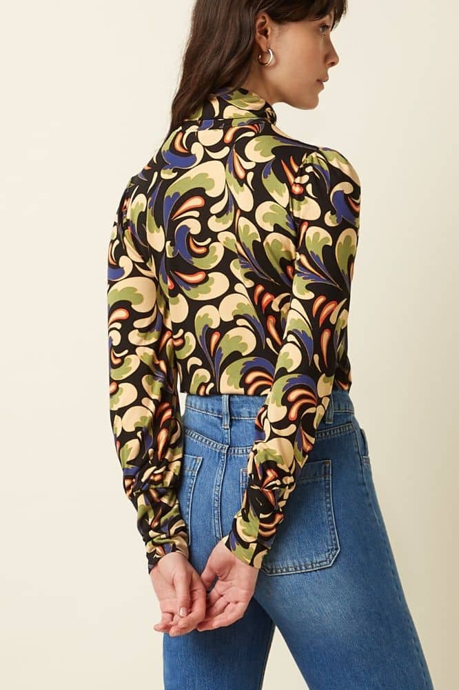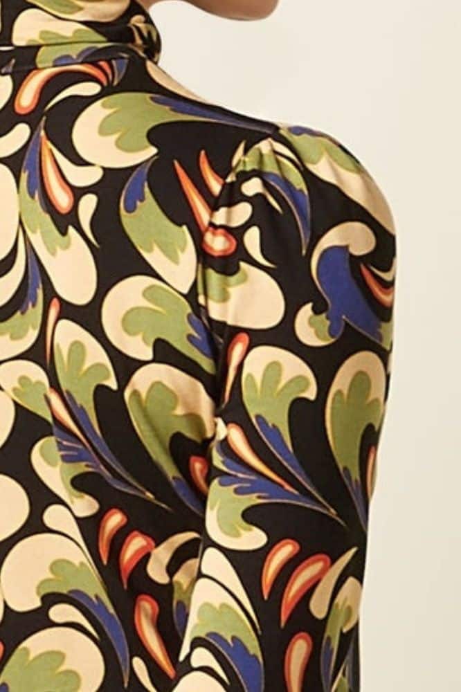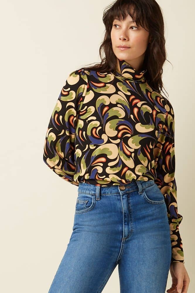 • ProductID / SKU: 10111001 • Model draagt: maat S, lengte 1,74 m • Pasvorm: aangesloten met stretch • Lengte: tot op de heup • Halslijn: turtle-neck • Mouwen: lange pofmouwen met brede manchetten • Sluiting: geen, stretchy instapmodel • Materiaal: 95% LENZING™ ECOVERO™ viscose, 5% elastaan • Stof: zachte, rekbare jersey • Print: retro grafisch dessin • Gemaakt in: Türkiye • Onderhoud: fijne was, binnenstebuiten in waszak