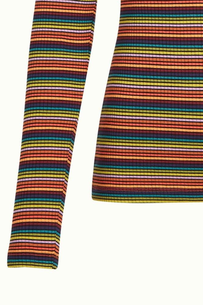Dankzij de opstaande turtle-neck oogt deze top net iets verfijnder dan een gewone longsleeve. Hij sluit mooi aan rond de hals en houdt je warm zonder dik of stug aan te voelen. De mouwen zijn lang, de zoom valt op de heup, en door het kleine beetje elastaan behoudt de stof zijn vorm was na was. De Rollneck Top Lumi Stripe is een veelzijdig item dat makkelijk combineert – of je hem nu draagt op een jeans, onder een jumpsuit of als basis onder een wollen trui.