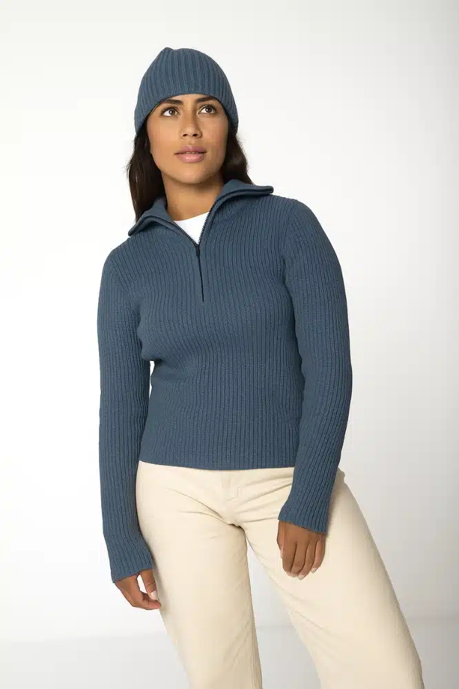 De Doutzen Schipperstrui Jeans van Roosenstein Wolke is dé damesvariant van de klassieke schipperstrui, speciaal ontworpen voor een vrouwelijke pasvorm zonder de stoere uitstraling te verliezen. Met zijn verfijnde parelvangsteek en subtiele heritage-details is dit een uniek stuk knitwear waarin traditie en modern design samenkomen. De trui heeft een half-zip rits aan de voorzijde, uitgevoerd in mat zwart met duurzame YKK-kwaliteit, en is afgewerkt met zwarte metalen accenten die direct refereren aan de iconische Rooscap-schipperspet.