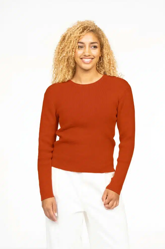 De warme rusty tint geeft een rijke en natuurlijke uitstraling die perfect past bij zowel herfst- en winteroutfits als frisse lentecombinaties. Draag de Liv Rib Trui op een jeans met sneakers voor een sportieve look of combineer met een rok en enkellaarsjes voor een meer geklede stijl. Dankzij de tijdloze vormgeving en hoogwaardige kwaliteit is dit een trui waar je jarenlang plezier van zult hebben.