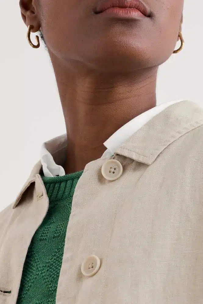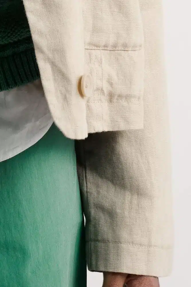 Wat dit jack zo bijzonder maakt, is de natuurlijke charme van het linnen. Het materiaal wordt met elke zomer zachter en soepeler, terwijl het unieke kleurnuances ontwikkelt die bijdragen aan de authentieke uitstraling van het kledingstuk. De ton-sur-ton knopen, praktische opgestikte zakken en subtiele details zoals de self-fabric hanging loop zorgen voor een stijlvol geheel dat jarenlang meegaat.