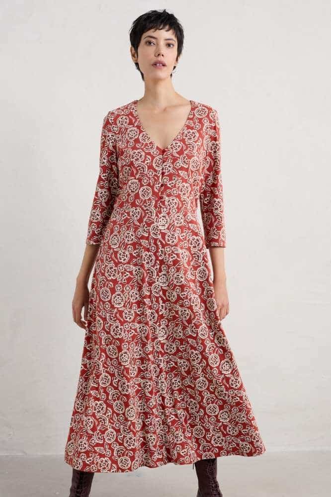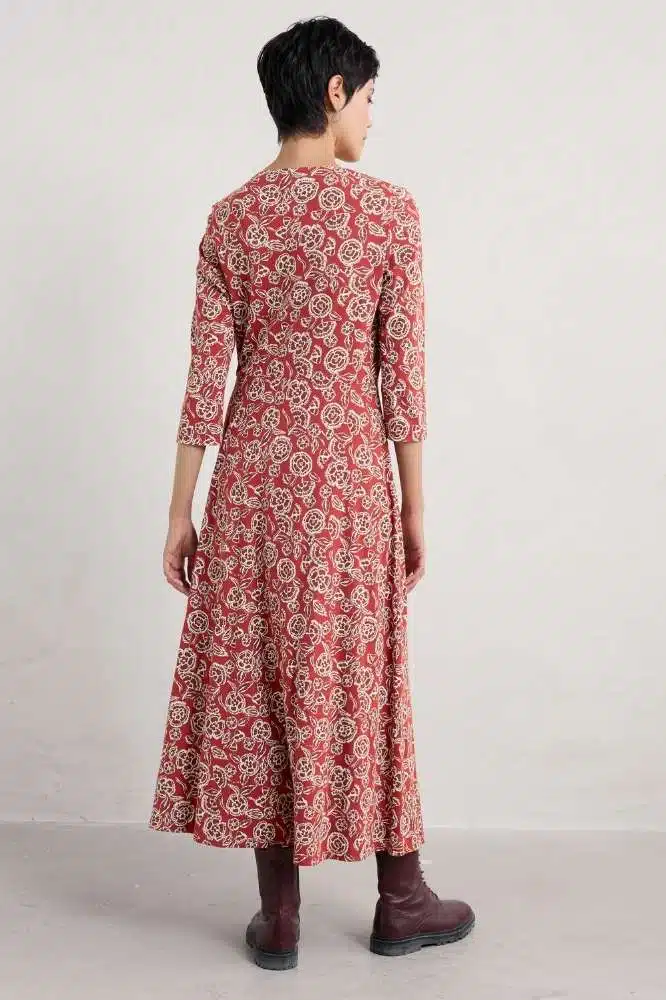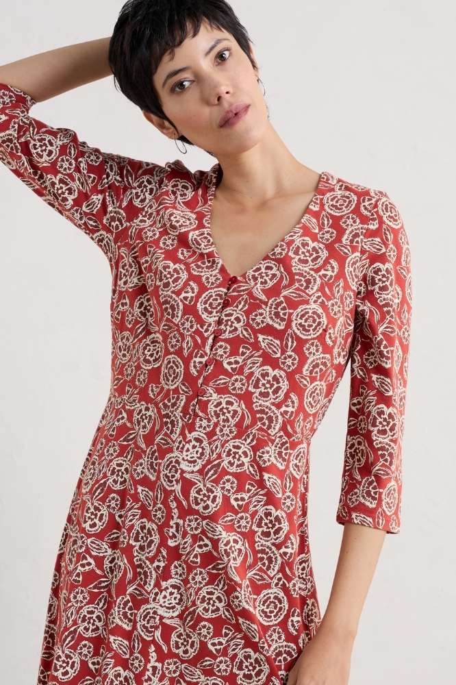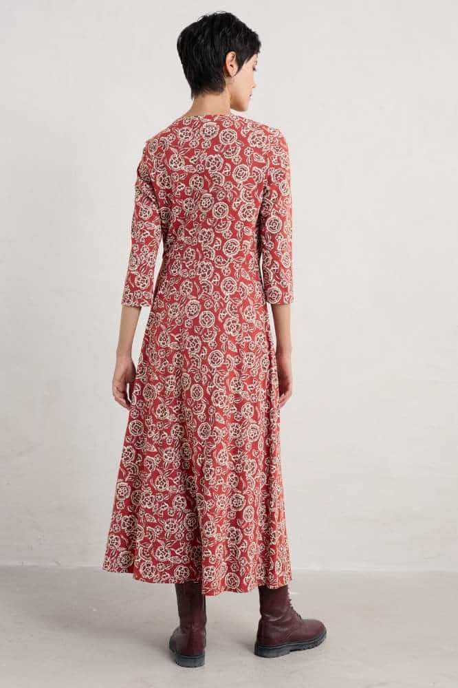 De Seasalt Cornwall Ava Dress Floral Pattern Umber is vervaardigd uit een zachte, stretchy blend van biologisch katoen en TENCEL™ Modal. Deze materialen bieden niet alleen een luxueuze feel maar dragen ook bij aan duurzaamheid. Het biologisch katoen is geteeld zonder schadelijke chemicaliën, en TENCEL™ Modal is afkomstig van hernieuwbare houtbronnen. Dit maakt de jurk niet alleen comfortabel maar ook milieuvriendelijk.