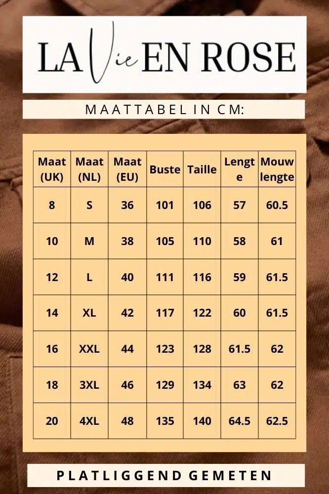 De afmetingen zijn genomen terwijl het kledingstuk plat ligt. De borst-, taille- en heupmaten geven de volledige omtrek van het kledingstuk weer.
