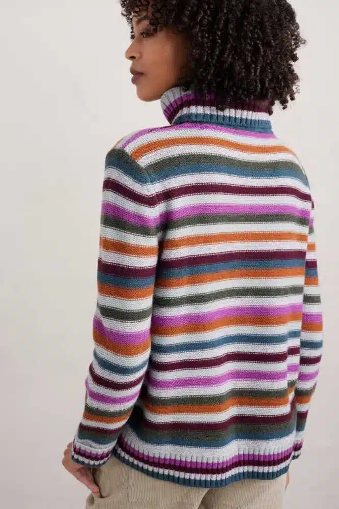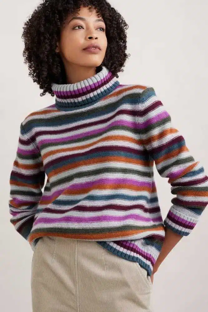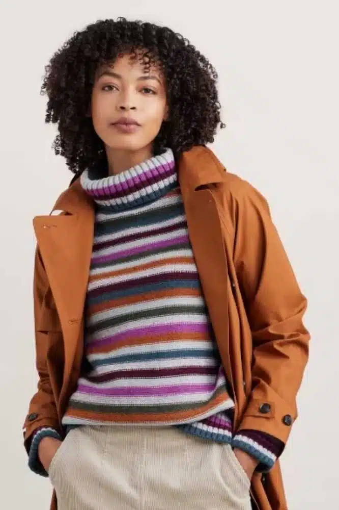 Deze zachte en warme Braque Jumper Interplay Wild Orchid van Seasalt Cornwall combineert traditionele stijl met moderne duurzaamheid. Gemaakt van een hoogwaardige mix van wol en gerecycled nylon, biedt de Braque Jumper optimale warmte en comfort tijdens de wintermaanden. De oversized col en opgerolde boorden voegen een speelse touch toe aan dit tijdloze stuk, terwijl de felgekleurde strepen en de reverse jersey-stitch een opvallende look creëren. Een perfecte aanvulling op je wintergarderobe die zowel stijlvol als milieubewust is.