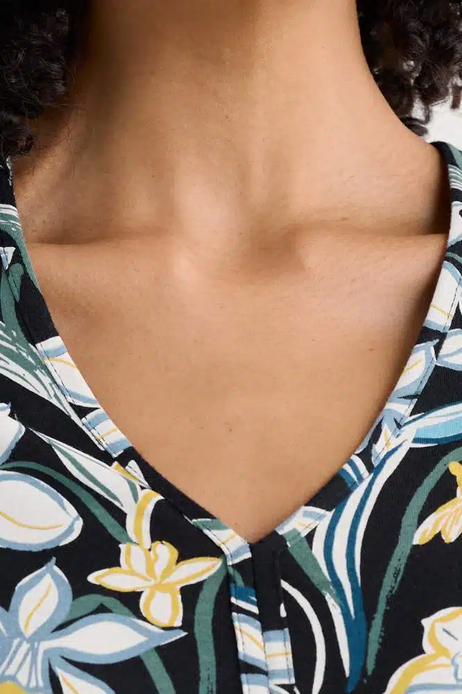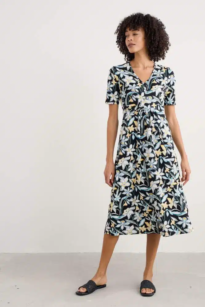 De Carwynnen Dress Painted Daffodil Inkwell van Seasalt Cornwall is een stijlvolle en duurzame keuze voor elke garderobe. Gemaakt van bamboe-viscose en biologisch katoen, voelt deze jurk heerlijk zacht aan op de huid en biedt een ademend draagcomfort. De speelse Painted Daffodil Inkwell-print geeft een unieke, artistieke uitstraling, terwijl de diepe V-hals en voorsneden details zorgen voor een flatterend silhouet.