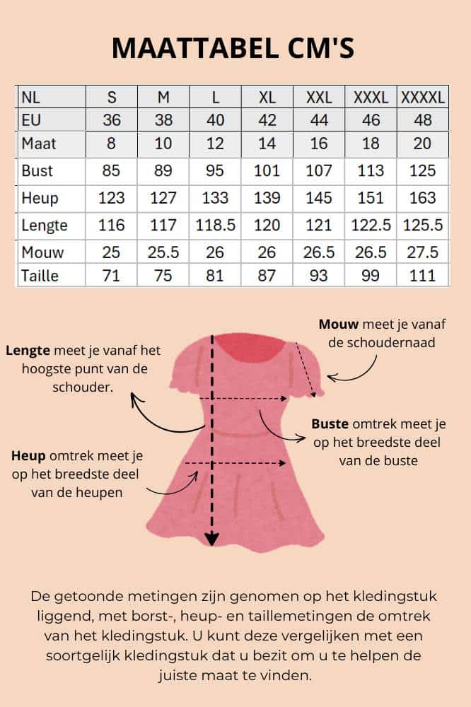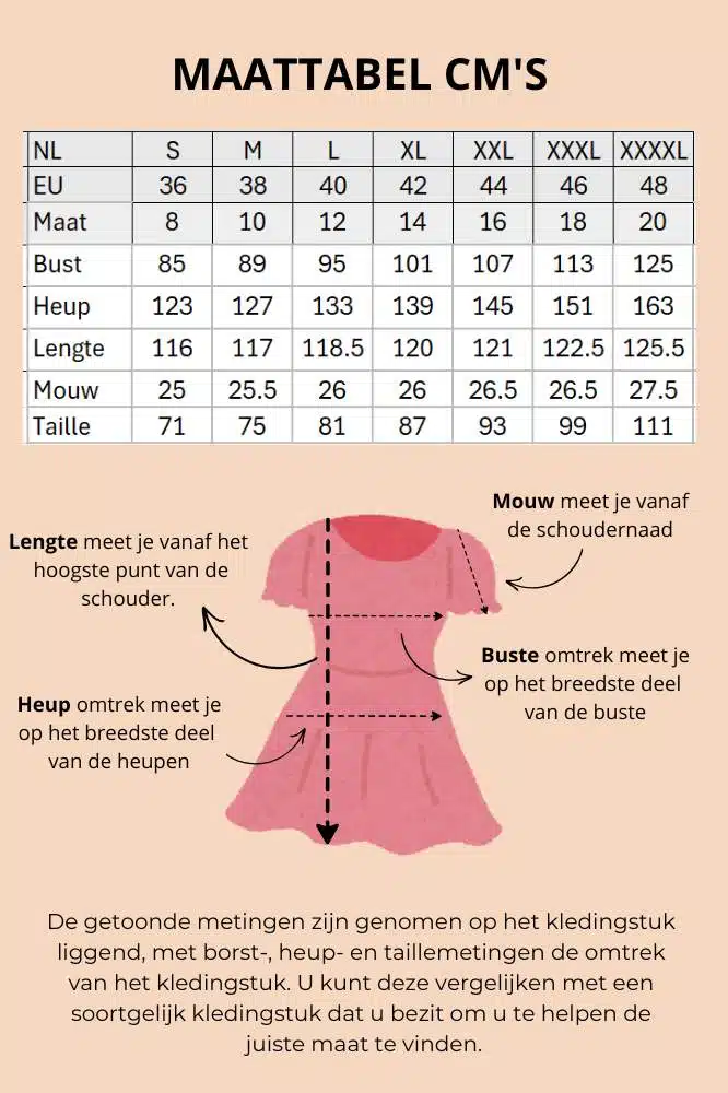 De jurk heeft een vrouwelijke pasvorm dankzij de tailleband met strik, die mooi aansluit op het lichaam. De subtiele plooien onder de taille voegen een elegant detail toe, waardoor de stof prachtig valt. Draag deze jurk in de zomer met blote benen en sandalen voor een luchtige look, of combineer haar in de koudere maanden met een panty en laarzen.