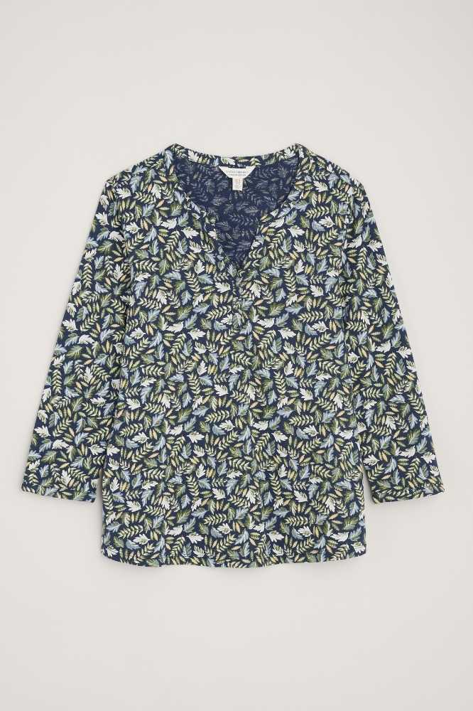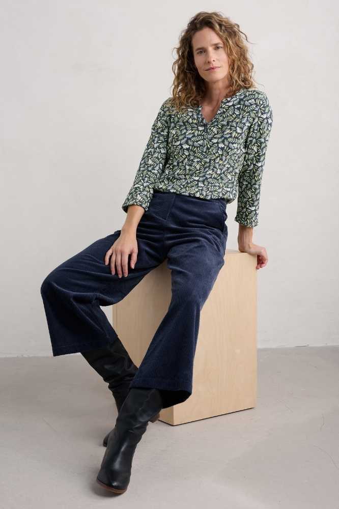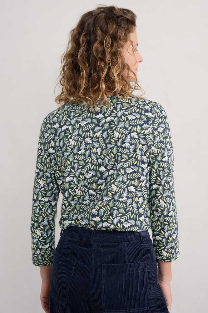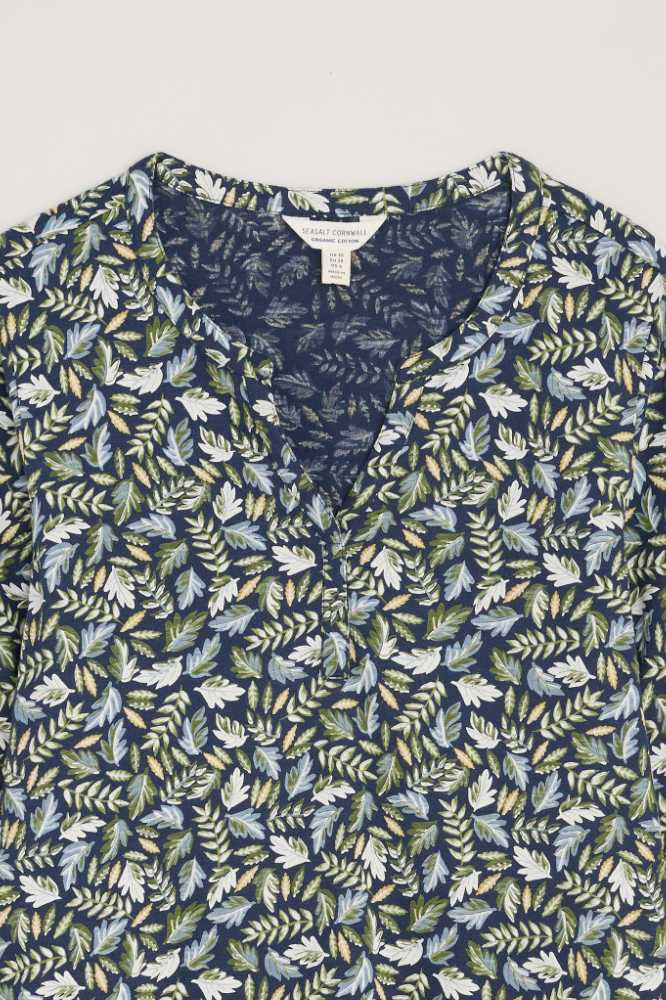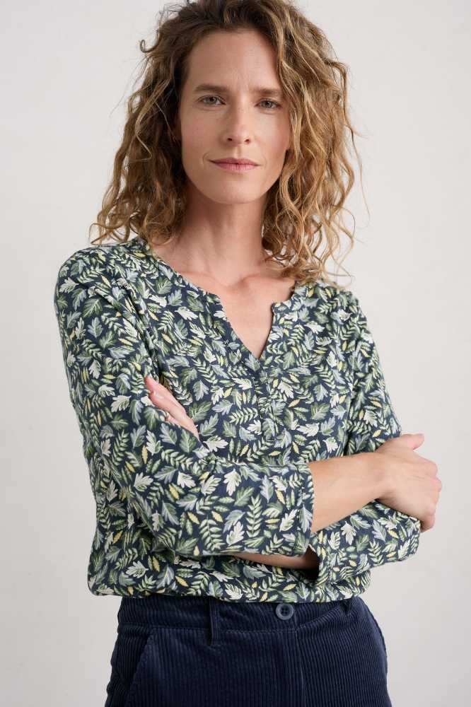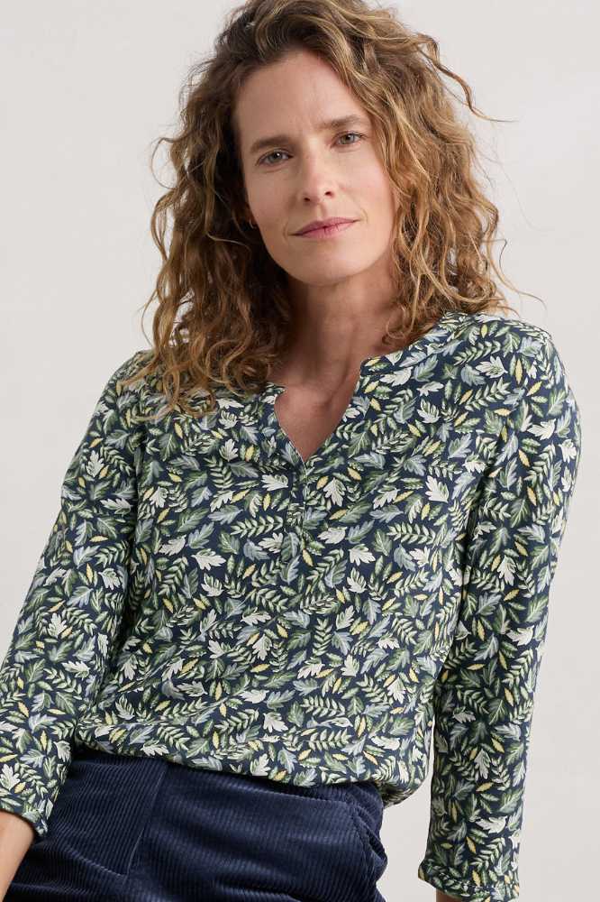 De Chantilly Top Sunlit Leaves Maritime van Seasalt Cornwall is een subtiele en veelzijdige top, perfect voor frisse herfstdagen. Met zijn delicate bladprint, geïnspireerd door de kust van Cornwall, en de fijne halslijn met notch-detail, voegt deze top een vleugje elegantie toe aan elke outfit. Het semi-gestructureerde model en de driekwartsmouwen maken het gemakkelijk te combineren met een eenvoudige jeans of rok, voor een ontspannen en stijlvolle look.