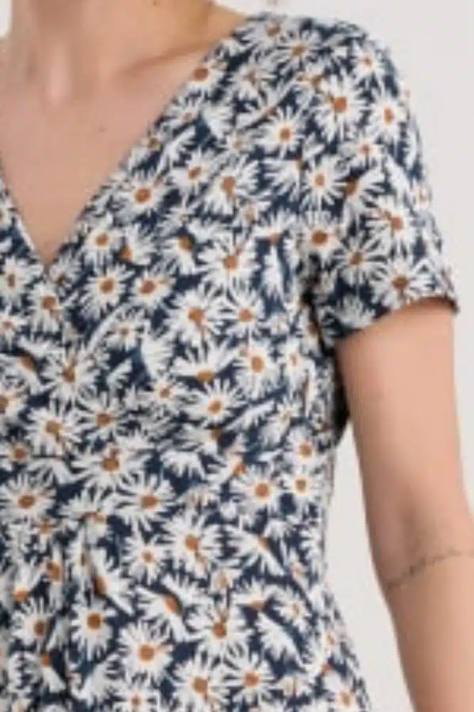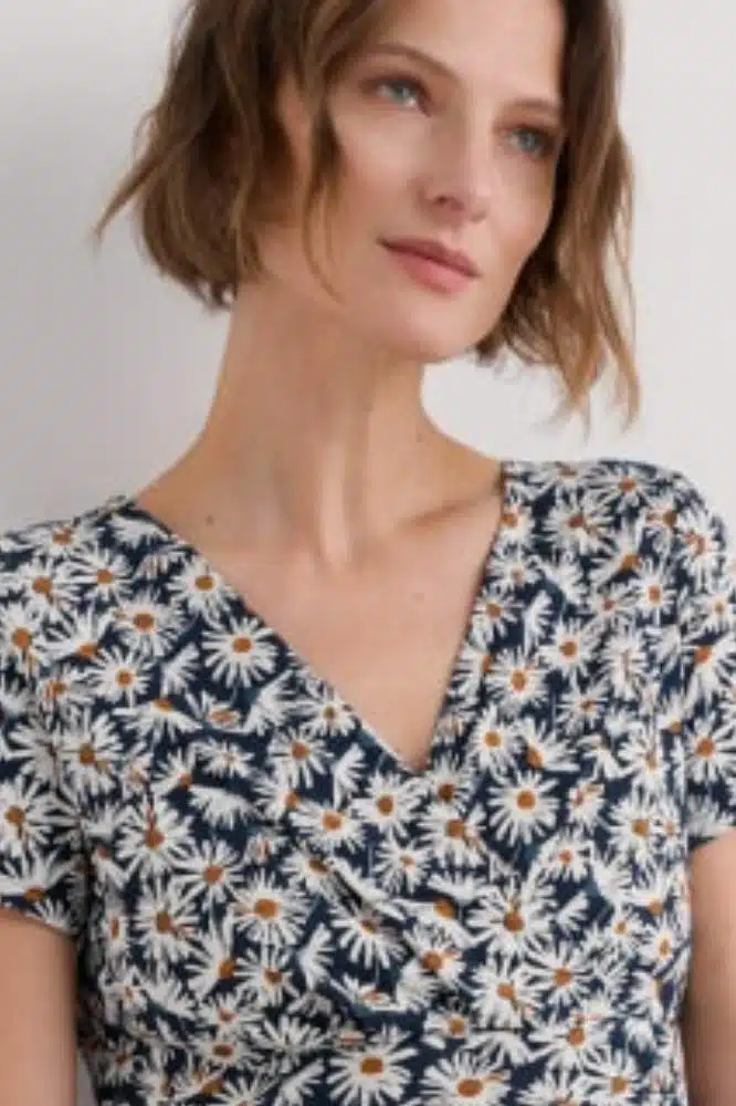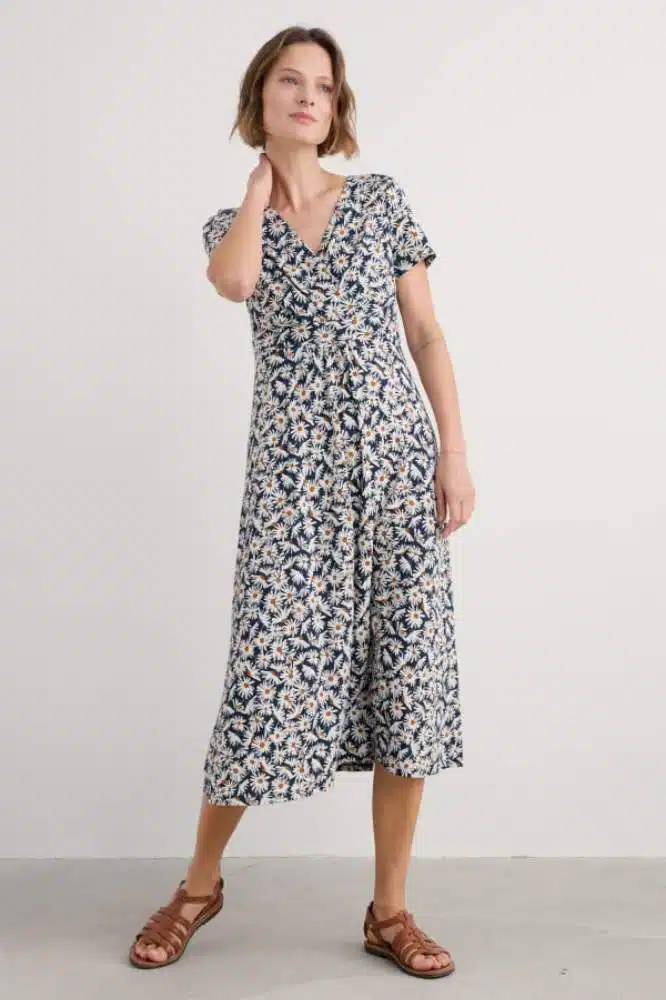 De Chapelle Dress Scatter Daisy Maritime van Seasalt Cornwall is een veelzijdige en elegante midi-jurk, gemaakt van heerlijk zacht en biologisch katoenjersey. Deze jurk is ontworpen met oog voor zowel stijl als comfort en is perfect voor verschillende gelegenheden. De Chapelle Dress heeft korte mouwen en een vrouwelijke wrap-stijl V-hals, waardoor een flatterend silhouet ontstaat. Onder de buste zorgen subtiele plooien voor een elegante en natuurlijke pasvorm. De A-lijn rok valt soepel en biedt een luchtig, draperend effect, wat deze jurk perfect maakt voor dagelijks gebruik.