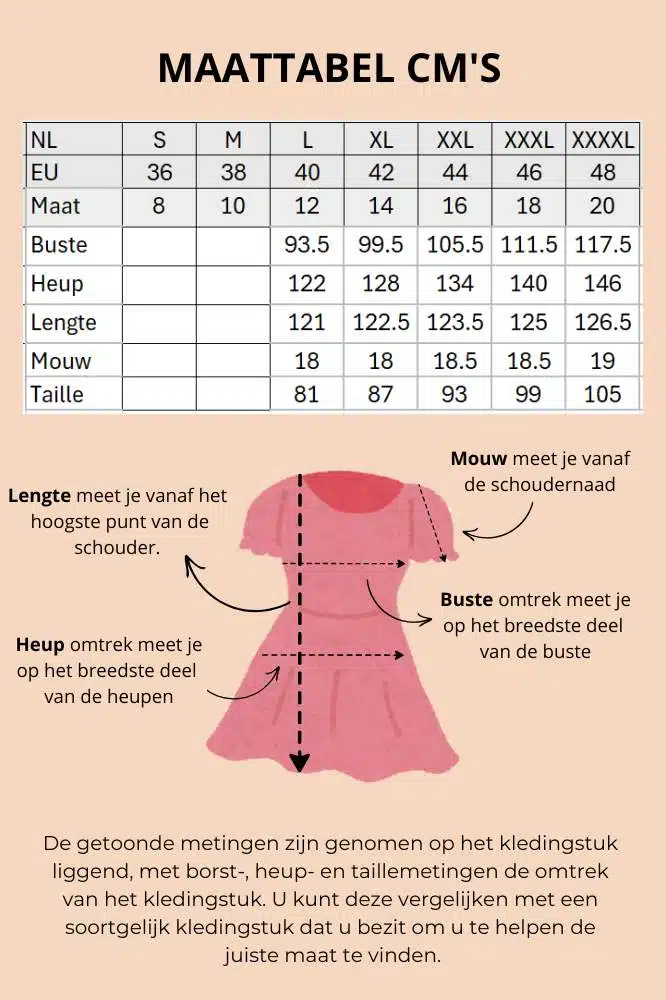 Om de levensduur van deze prachtige jurk te verlengen, raden we aan om hem op 30°C in de wasmachine te wassen. Gebruik een mild wasmiddel en vermijd bleekmiddel of agressieve schoonmaakmiddelen. Laat de jurk aan de lucht drogen en strijk op lage temperatuur indien nodig. Door zorgvuldig met je kleding om te gaan, draag je bij aan een duurzamere garderobe.