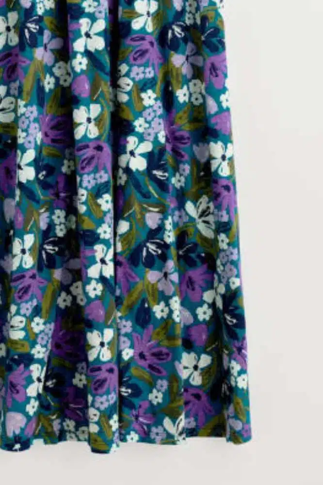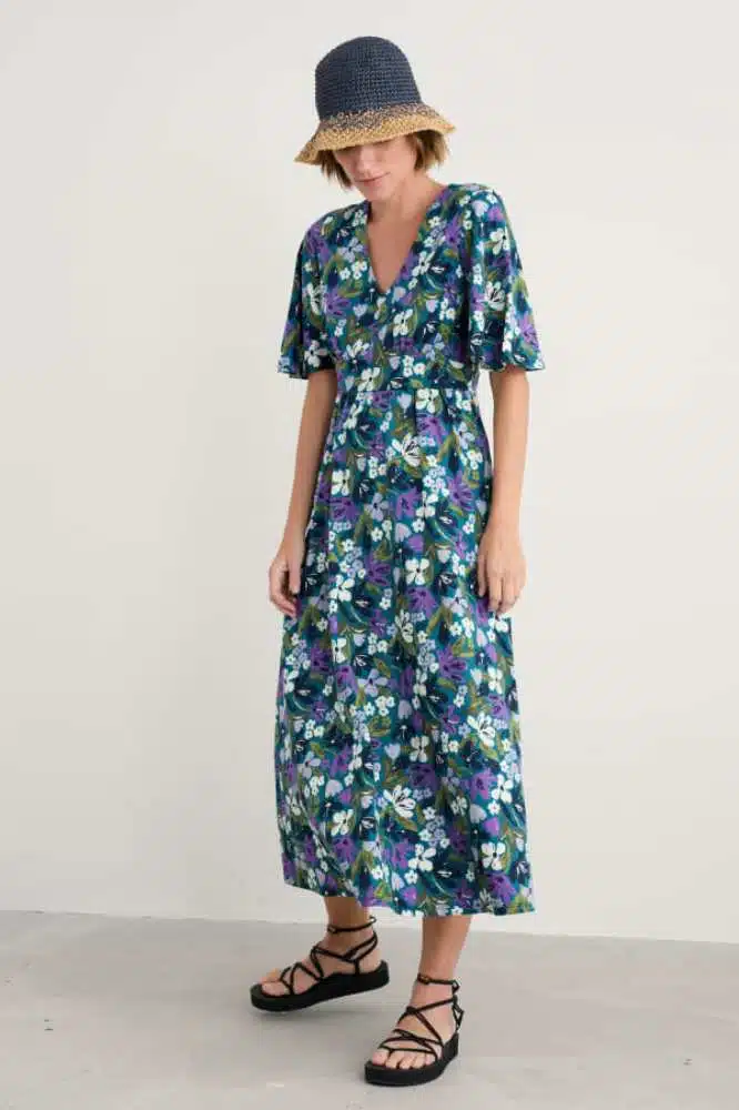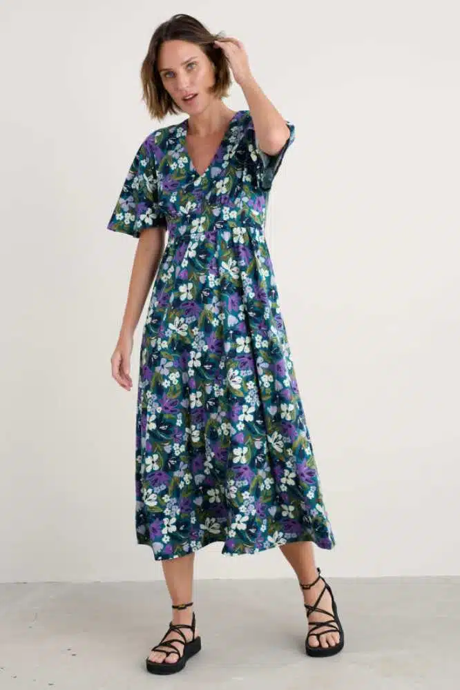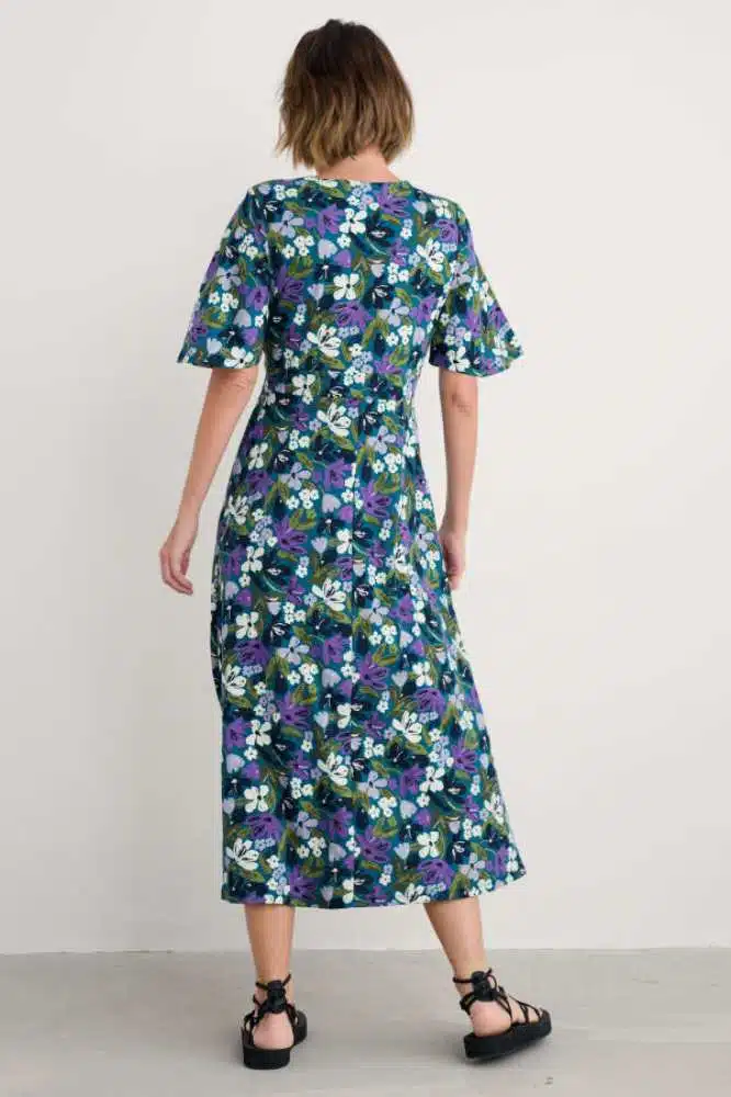 De Chateaux Dress in Crayon Floral Dark Drift van Seasalt Cornwall is een betoverend vrouwelijke jurk met een vleugje vintage flair. Deze jurk combineert elegantie met comfort en is een perfecte keuze voor wie houdt van tijdloze stijl met een moderne twist. De diepe V-hals en subtiel geplooide empirelijn zorgen voor een flatterend silhouet, waarbij het paneel onder de buste elegant overloopt in een zwierige rok tot net boven de enkels. De halflange angel sleeves geven de jurk een speelse, luchtige uitstraling, ideaal voor warmere dagen of laagjes in koelere seizoenen.