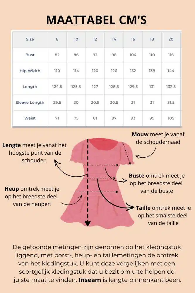 Was de jurk binnenstebuiten in de machine op 30 graden. Gebruik een mild wasmiddel, vermijd bleekmiddelen en hang haar aan de lucht te drogen. Strijk op lage temperatuur indien nodig. Zo blijft je jurk het mooist.