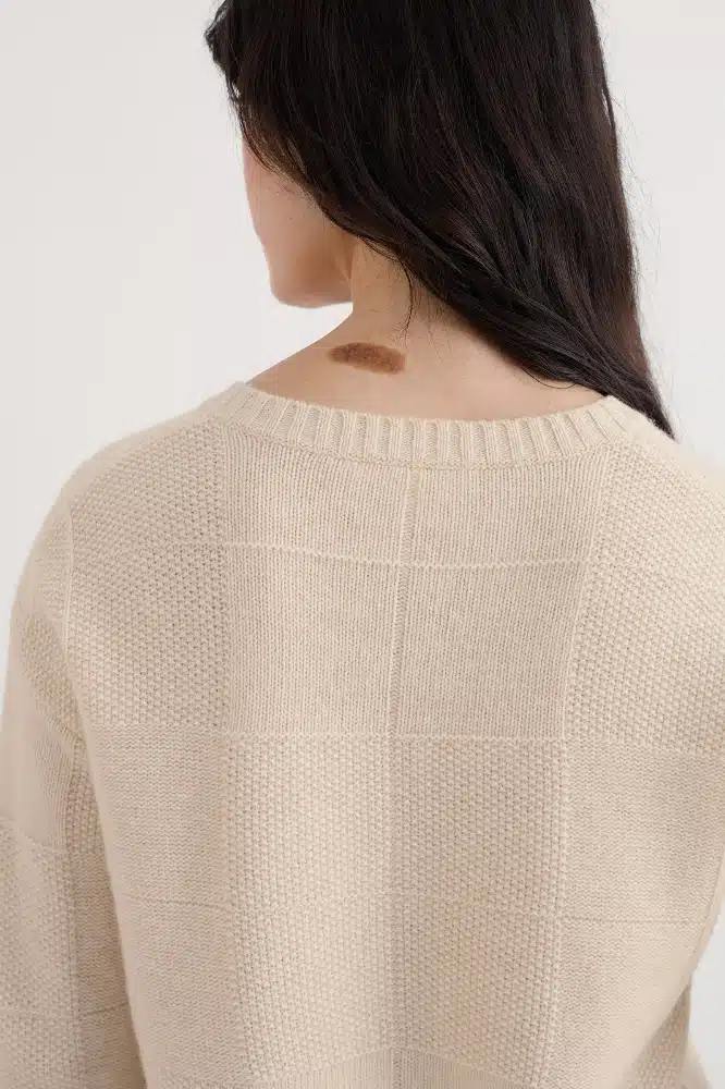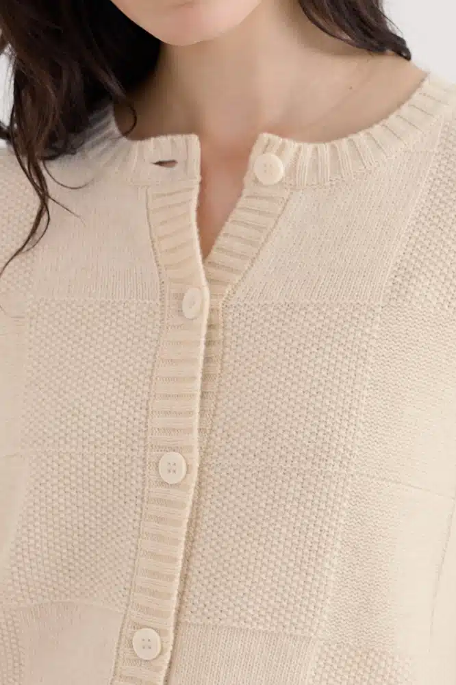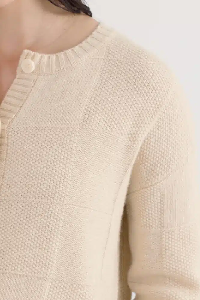 • ProductID / SKU: 5056811283434 • Fit: relaxed fit, valt iets wijder • Halslijn: ronde crew neck • Mouwen: lange mouwen met dropped sleeves • Sluiting: knoopsluiting met mock horn knopen • Afwerking: ribgebreide zoom en manchetten • Breisel: 5-gauge knit • Materiaal: 80% merinowol, 20% gerecycled nylon • Certificering: RWS-gecertificeerd (Control Union CUC 885150) • Gemaakt in: Bangladesh, volgens ethisch handelsbeleid