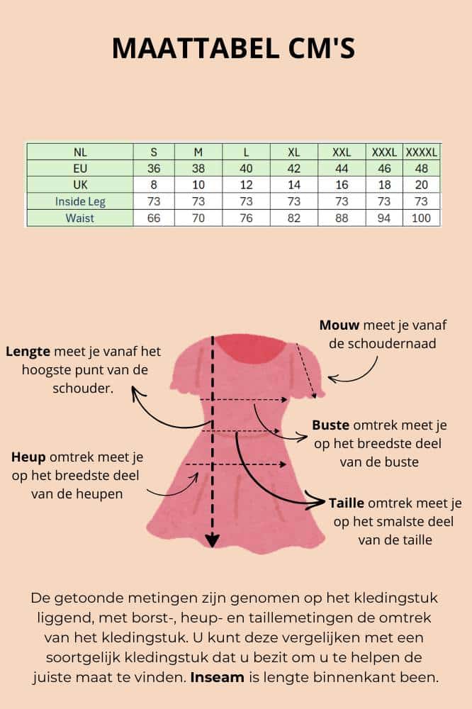 • Taille: zit net onder de natuurlijke taille, elastische achterzijde