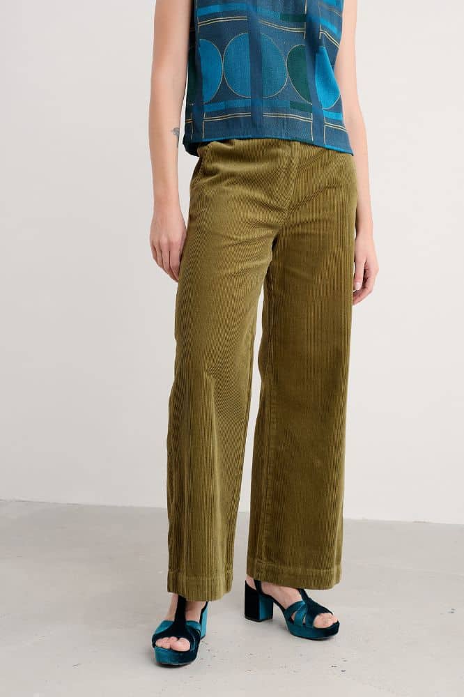 De Dillwyn Trouser in Bright Olive is een stijlvolle wide leg broek van zachte, biologische corduroy. Met hoge taille, diepe zoom en prachtig vallende pijpen. Tijdloos, comfortabel en perfect voor elke dag.