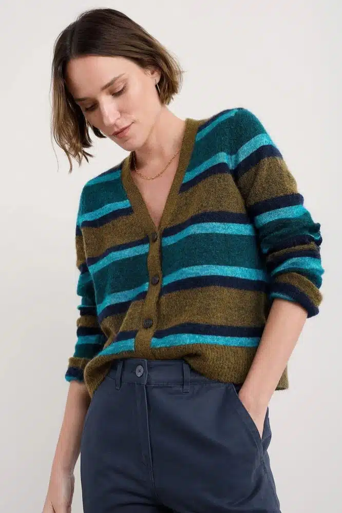 Details Etching V-Neck Cardigan with RWS Mohair Earthenware Cyan Mix