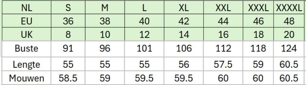 • Mouwen: lange mouwen met diepe ribboorden